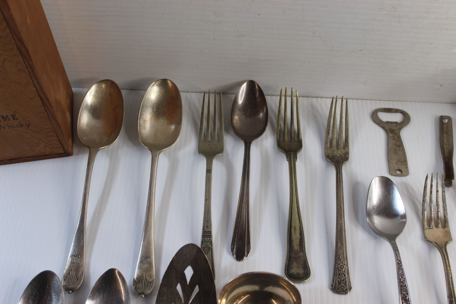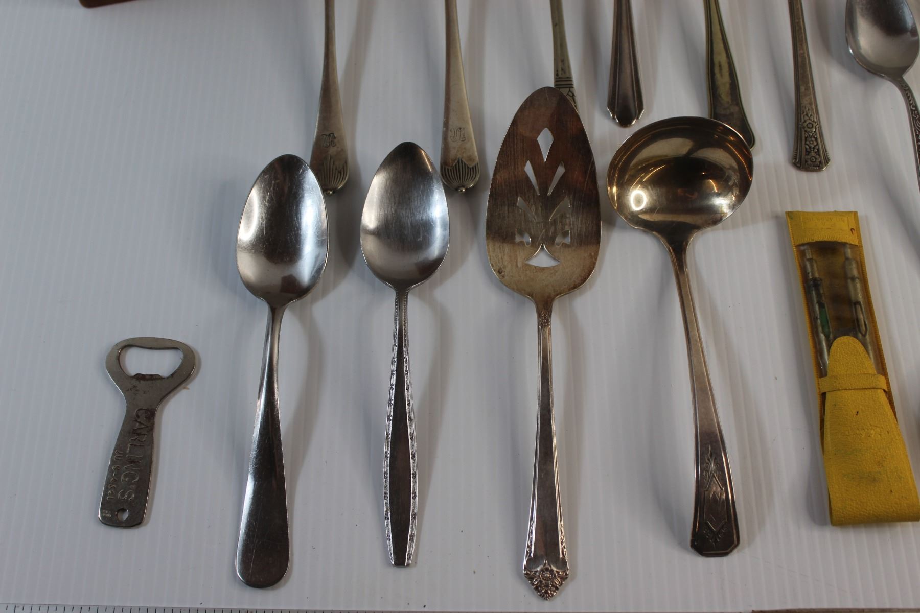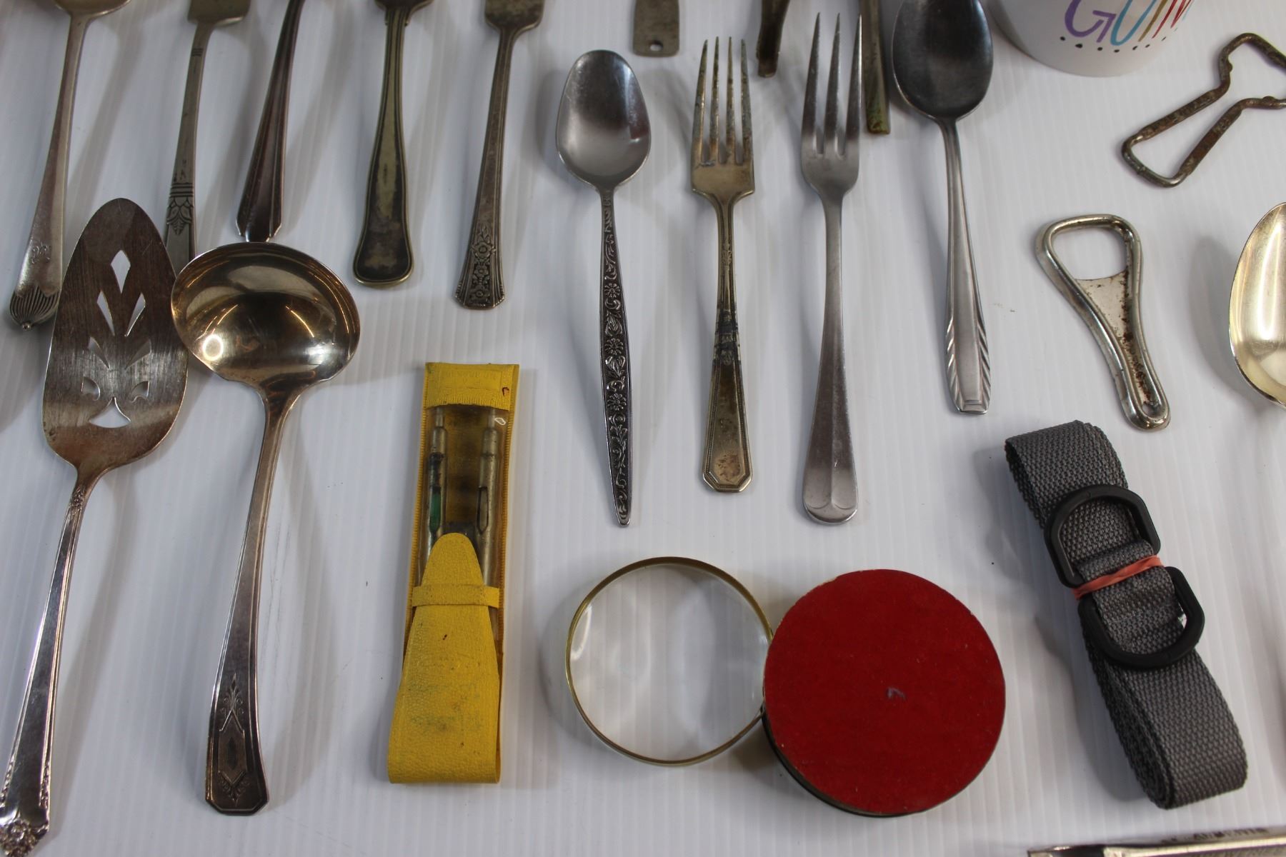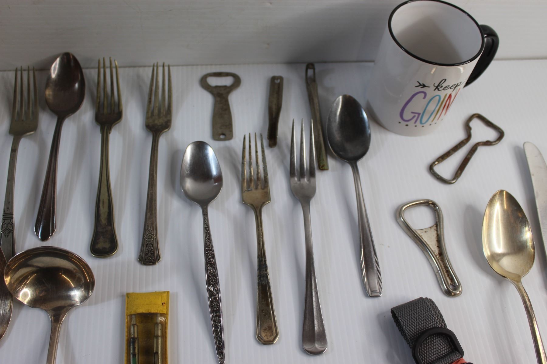 Spoons, Forks, Bottle Openers, Dining Knives, Magnifying Glass, Ceramic Mug and Misc.