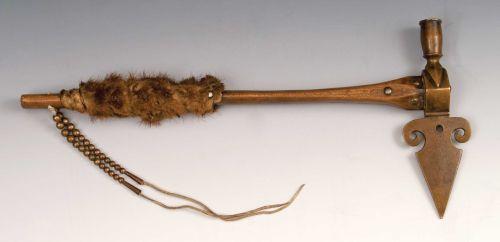 Spoontoon Pipe Tomahawk. Tacked and fur decorated 17" haft. Fancy brass head. 19th Century. (est $3,500-4,500)