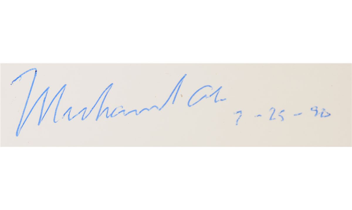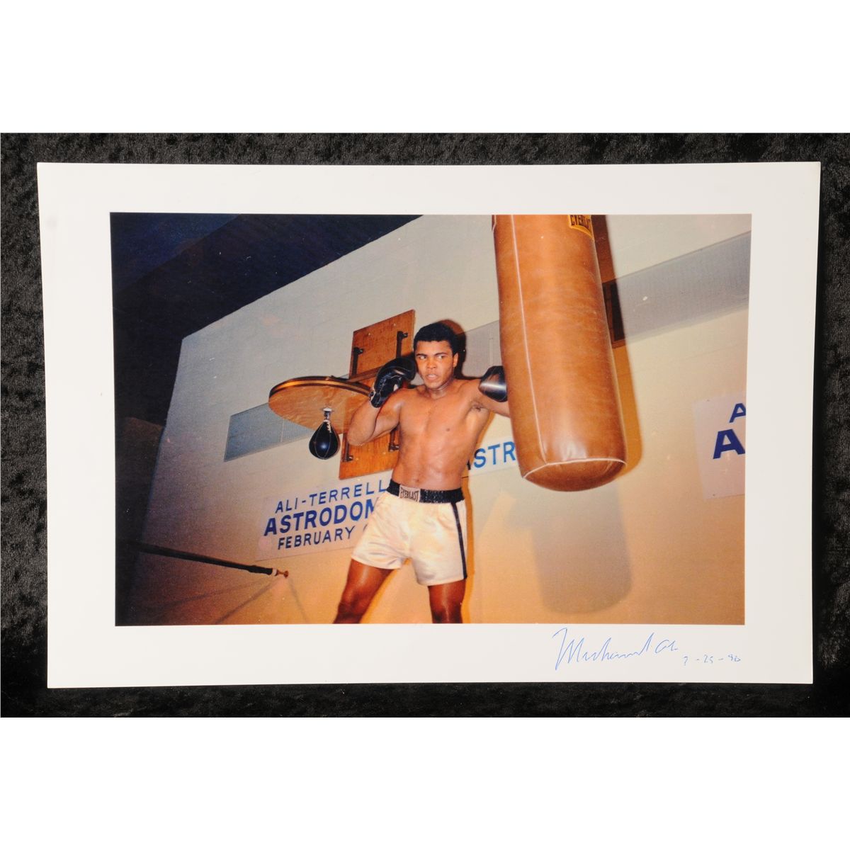 The colour image showing Ali in a three quarter length view striking a punch bag. Signed in blue ballpoint pen ink by Ali to a clear area of the image and dated 7/25/90 in his hand.
