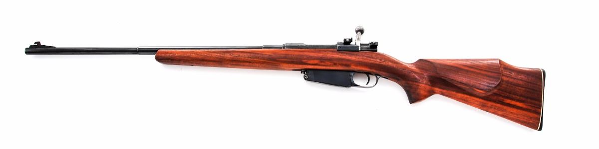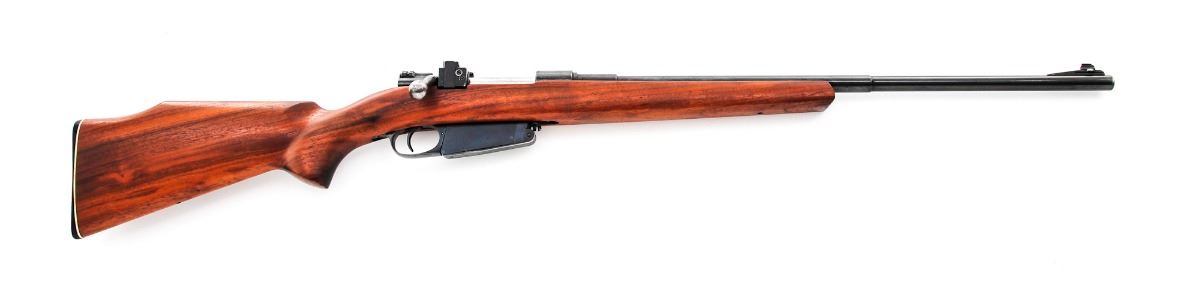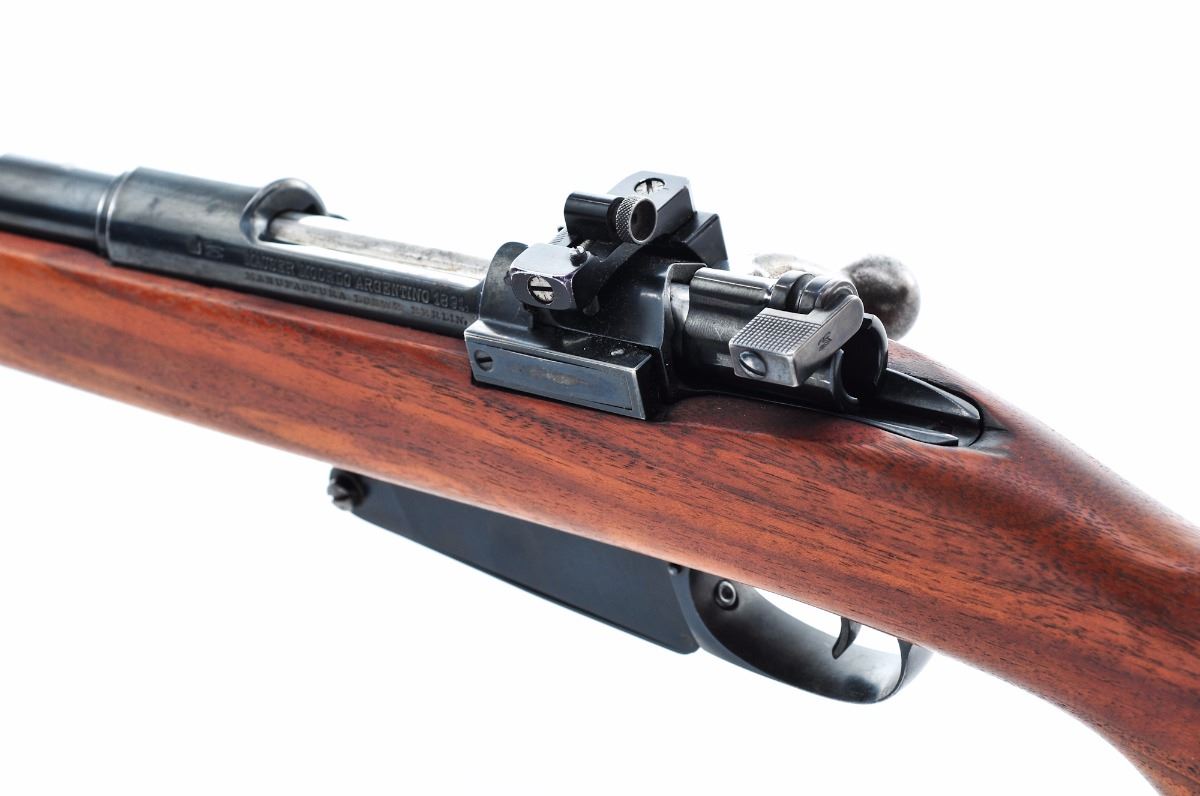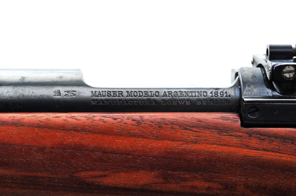 Sporterized Argentine Mauser Model 1891 Bolt Action Rifle, by Lowe, Berlin, #F8099, 8mm Mauser cal., 24'' barrel, blue finish, smooth walnut cheekpiece stock, with ramped blade front sight and Williams peep rear sight. Condition is excellent as re-blued and re-stocked retaining approx. 95% re-blue. Stock is in excellent condition with no cracks or losses; buttplate is marked ''Bishop''. Action is tight, bore is strong with some corrosion but may clean to very good. Est.: $150-$300. (C&R)