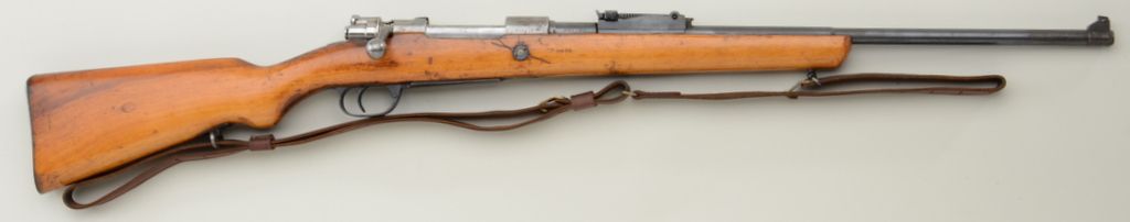 Sporterized Argentine Mauser Model 1909 bolt-action rifle, .30-06 cal., 23” barrel, military finish, wood stock, A9779 with commercial Hunter brand leather sling. This gun is in overall good condition assporterized with fair bore, good action and fair stock with scattered mars and scratches from carry and storage. Est.: $50-$100.