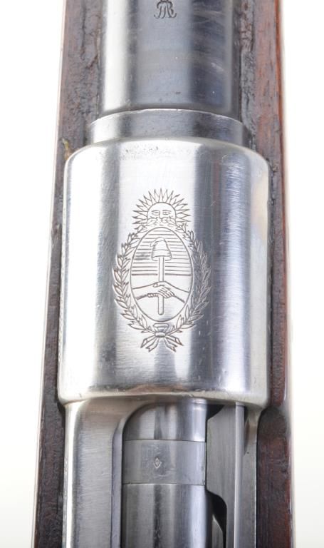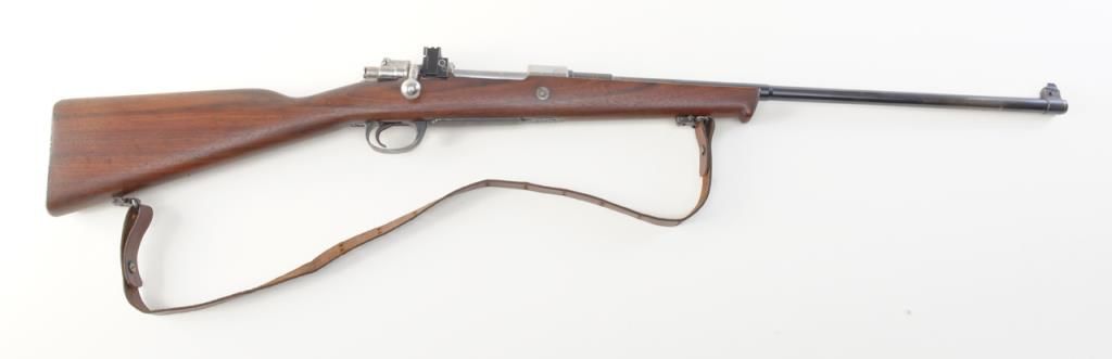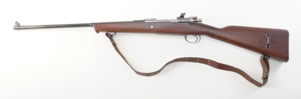 Sporterized Argentine Mauser Model 1909 bolt action rifle, 7.65mm cal., 22-1/2” barrel, blue finish, wood stock, leather sling, Williams adjustable receiver-mounted sight, #A9019 in overall good condition showing muted re-blue finish to barrel, bright finish to the receiver, very good bore, crisp action, very good markings and wood. Est.: $250-$350.