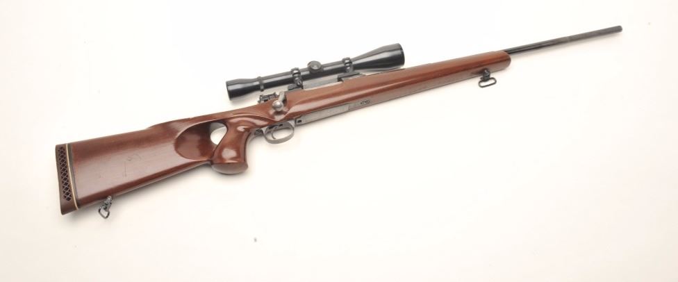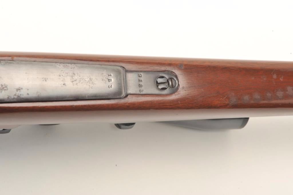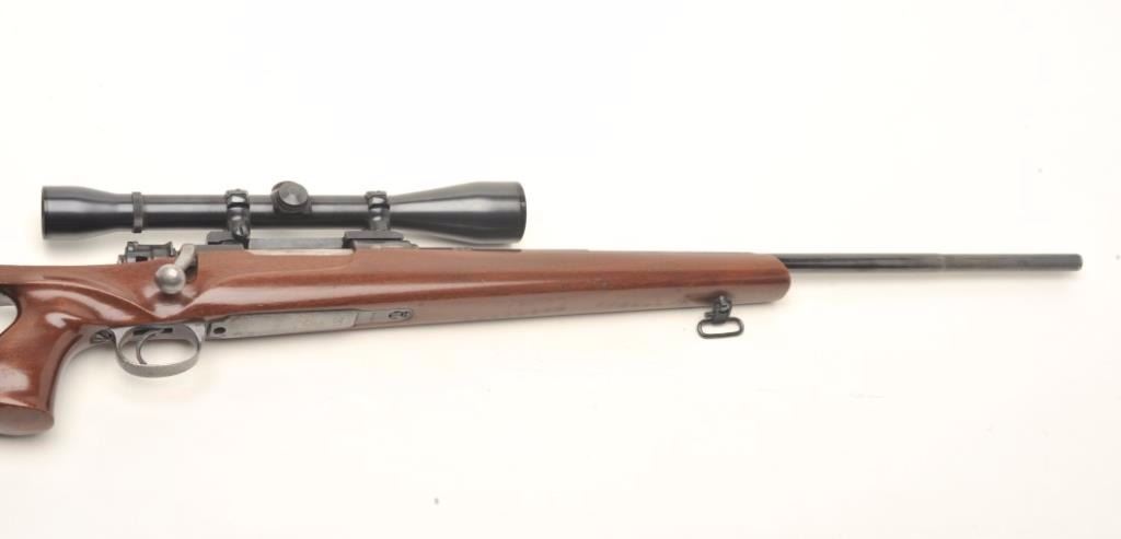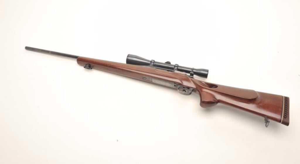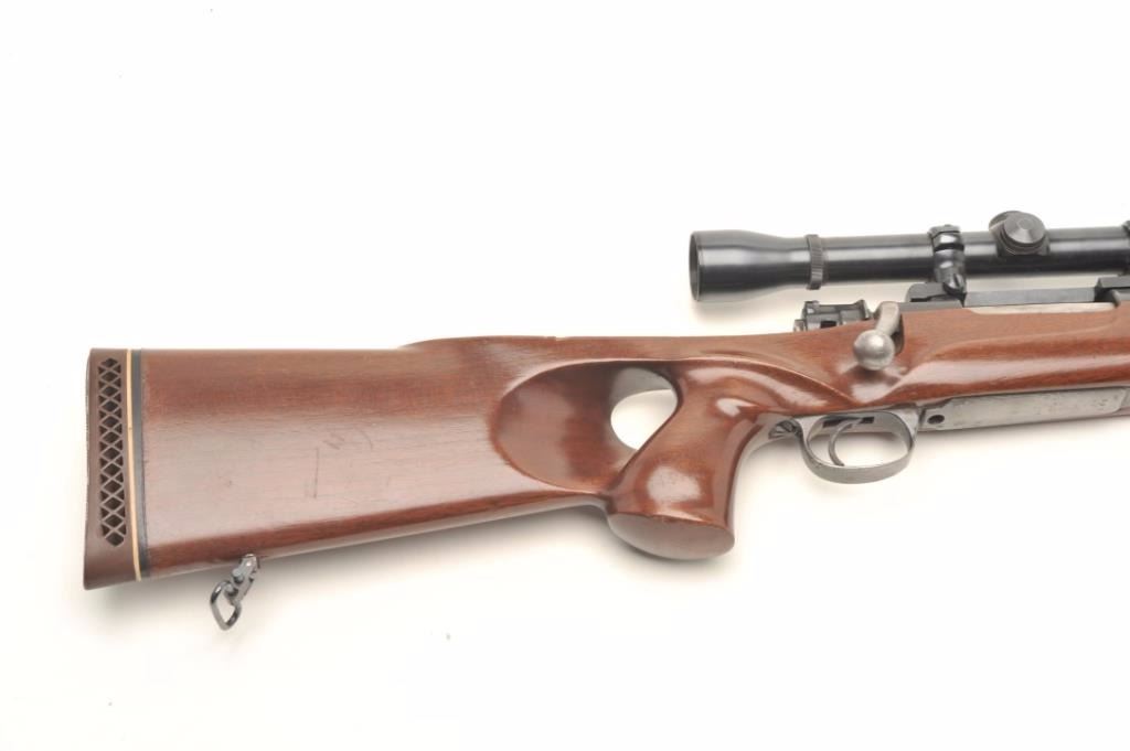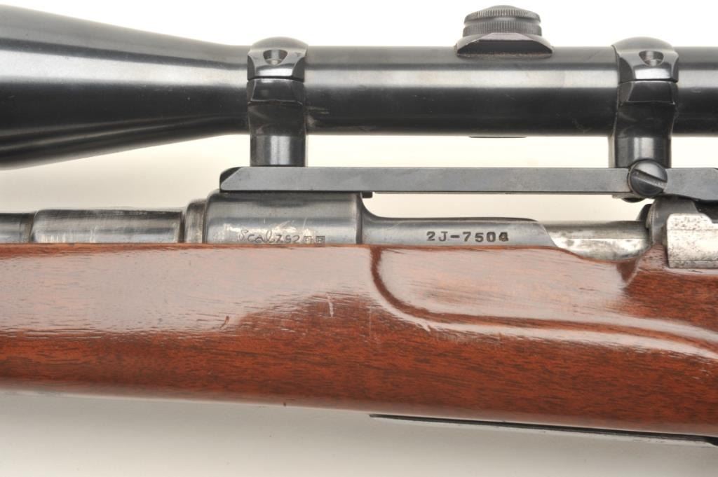 Sporterized Belgian Mauser bolt action rifle, 7.92 mm caliber, 24” stepped barrel, blued finish, custom thumb groove wood stock with quick release sling swivels, White Line hard rubber butt pad, S/N 2J-7504; mounted with aWeaver K6 60C scope with good optics; a prop used in the3 movie “Inglorious Bastards” starring Brad Pitt, Melanie Laurent and Michael Fassbender. (C&R). Est.: $300-$600.