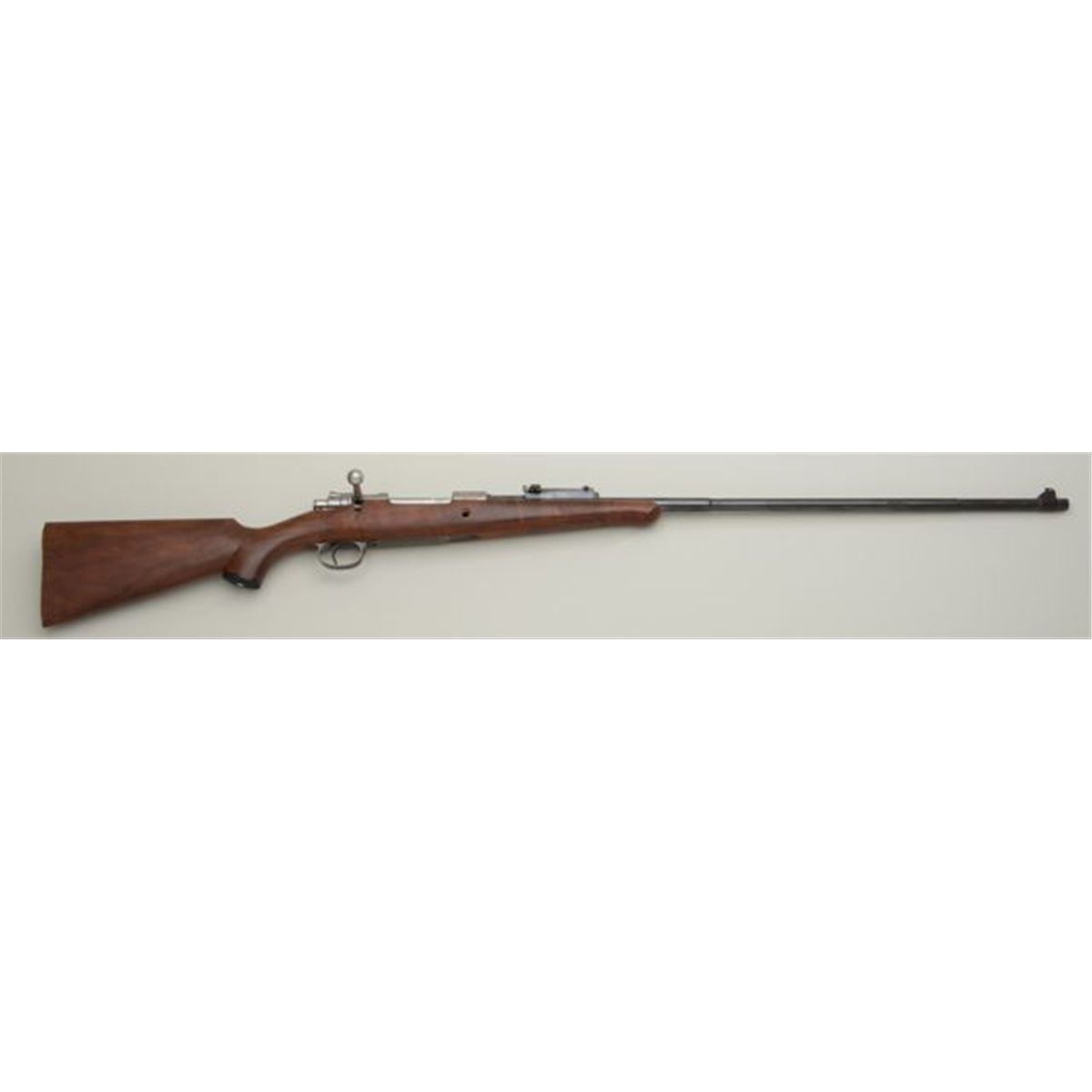 Sporterized Brazilian Mauser bolt-action rifle, 7.62mm cal., 29-1/2” barrel, blue finish to barrel, receiver in the white, wood stock missing butt plate, #3588. This customized gun is in overall very goodcondition showing a good bore, action, markings and modern wood stock that needs final detailing. Est.: $150-$300.