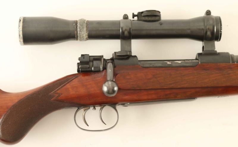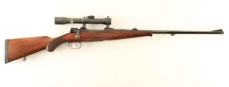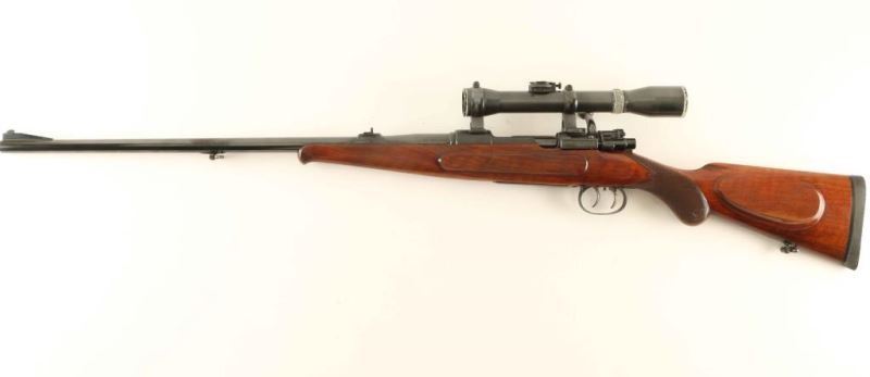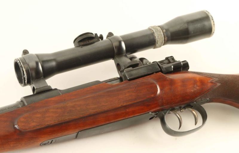 SN:1654. Sporterized Mdl 98 Mauser with a 22" barrel. Double set triggers, custom walnut stock, 1" sling swivels, custom scope mount with German 'OIGEE' scope-4 power with German post. Optics are clear, bore is bright with strong rifling. NRA Very Good ***Modern Firearm**