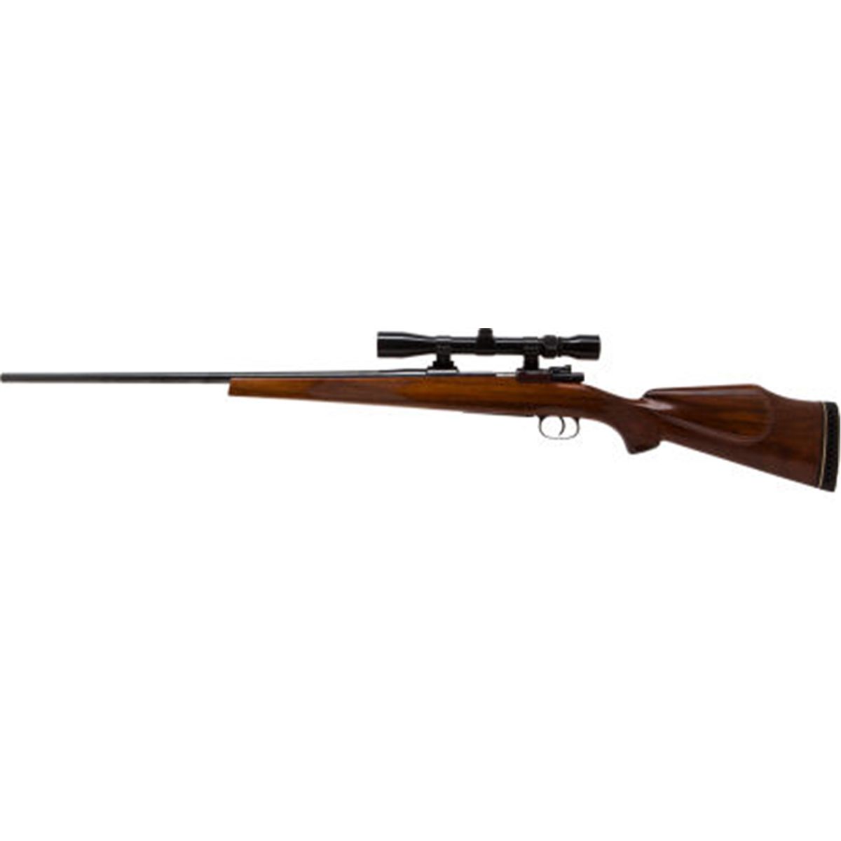 Sporterized Mauser M98 Bolt Action Rifle. Serial no. 1133, .22-250 caliber, 24-inch barrel without sights and mounted with Tasco 3x-9x telescopic sight. Blued finish. High gloss, slightly figured walnut Monte Carlo stock with cheek piece. Fine checkering to forearm and pistolgrip. Rubber recoil pad.Condition: Very good as configured. Retaining approximately 95-98% original finish on custom barrel. Light muzzle and handling wear. Light storage wear on stock. Bright bore with wear.NRA FIREARMS FOR FREEDOM PROGRAM