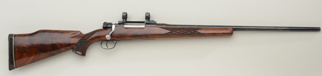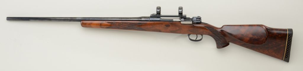 Sporterized Mauser Model 98 bolt-action rifle, .243 Win. cal., 24” round barrel, re-blued finish, checkered custom wood stock, #9298; with Redfield scope base and rings (no scope). This gun is in overall goodcondition as sporterized showing the majority of its re-blued finish, good bore and action, beautifully grained deluxe wood stock; hard rubber butt pad. Est.: $300-$500.