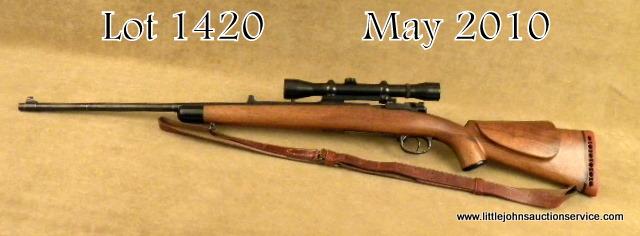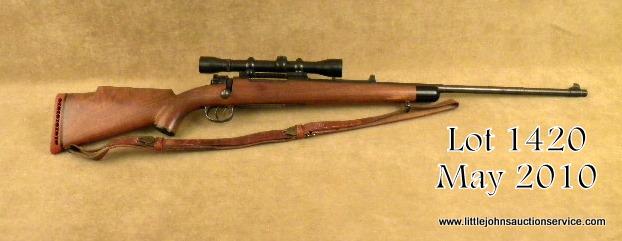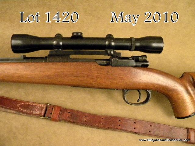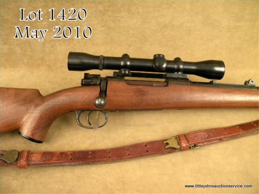 Sporterized Mauser Model 98 bolt-action rifle, nazi proofed, 7.92mm cal., 24” barrel, re-blued finish, wood stock with Monte Carlo cheek piece, dark contrasting fore stock cap, red hard rubber butt pad, sling swivels, Boyt leather sling,#6822. This gun is in overall good condition as sporterized; majority of re-blue remains with some scattered spots of erosion and pitting, good bore, crisp action, good markings, good wood with some scattered mars and scratches from carry andstorage; mounted with Buehler scope mounts and Weaver K-4 60B scope with very good optics. Est.: $100-$200.
