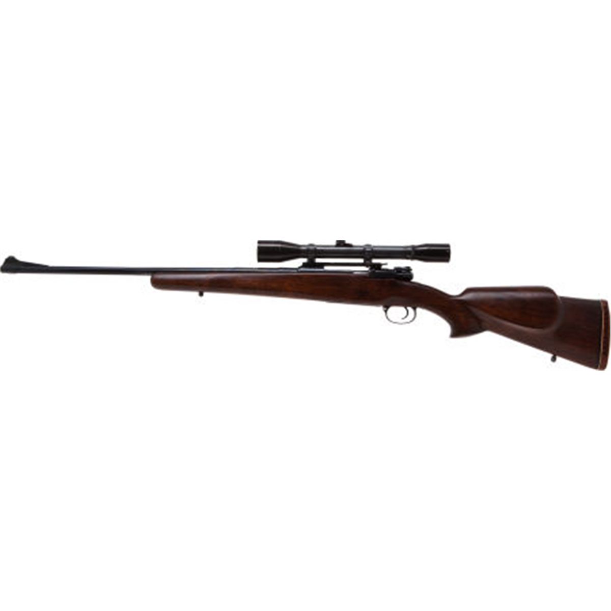 Sporterized Mauser Model 98K Bolt Action Rifle with Telescopic Sight. Serial No. 9358E, 7.92mm, 22-inch barrel with hooded front sight and mounted with Unertl Condor 6X telescopic sight. Blued finish. Custom varnished walnut Monte Carlo pistol-grip sporter stock with red recoil pad. Sling eyes. Condition: Good as reconfigured and refinished. Retaining approximately 95-100% reblued finish with scattered light wear. Wood refinished. Action good. Bore with light wear. NRA FIREARMS FOR FREEDOM PROGRAM