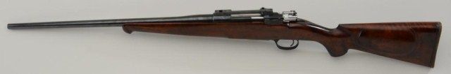 Sporterized Mauser bolt-action rifle, appears to be 6.5mm cal. but should be checked out by a gunsmith, 21-1/2” barrel, re-blued finish, custom wood stock, Leupold scope mount, #NVSN. This gun is in overall goodcondition with a good bore, action and beautiful custom wood stock; hard rubber butt stock. Est.: $200-$400.