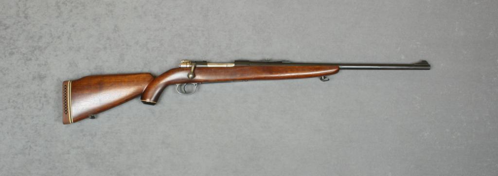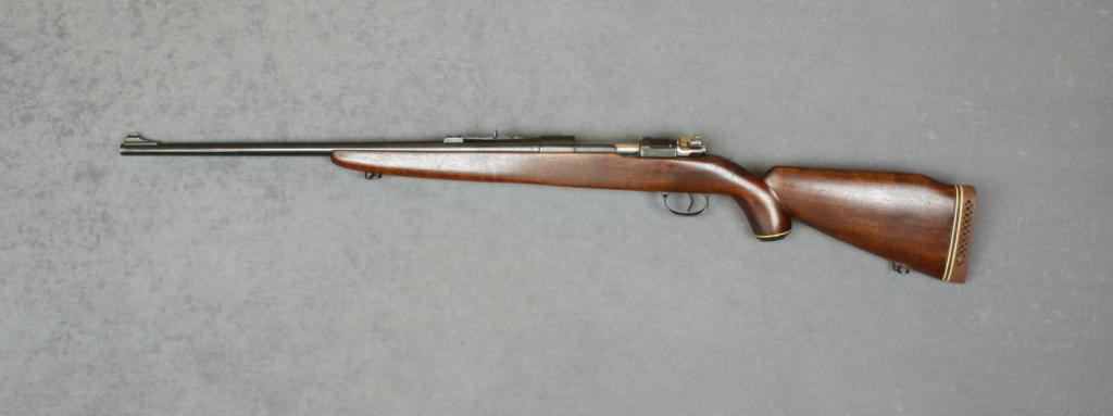 Sporterized Mauser bolt-action rifle by Santa Fe Arms, 7.65 cal., 22” barrel, re-blued finish, pistol grip half stock with sling swivels, #18713. This gun is in overall good condition as sporterized and refinished; good bore, action and wood stock with White Line rubber butt pad. Est.: $75-$150.