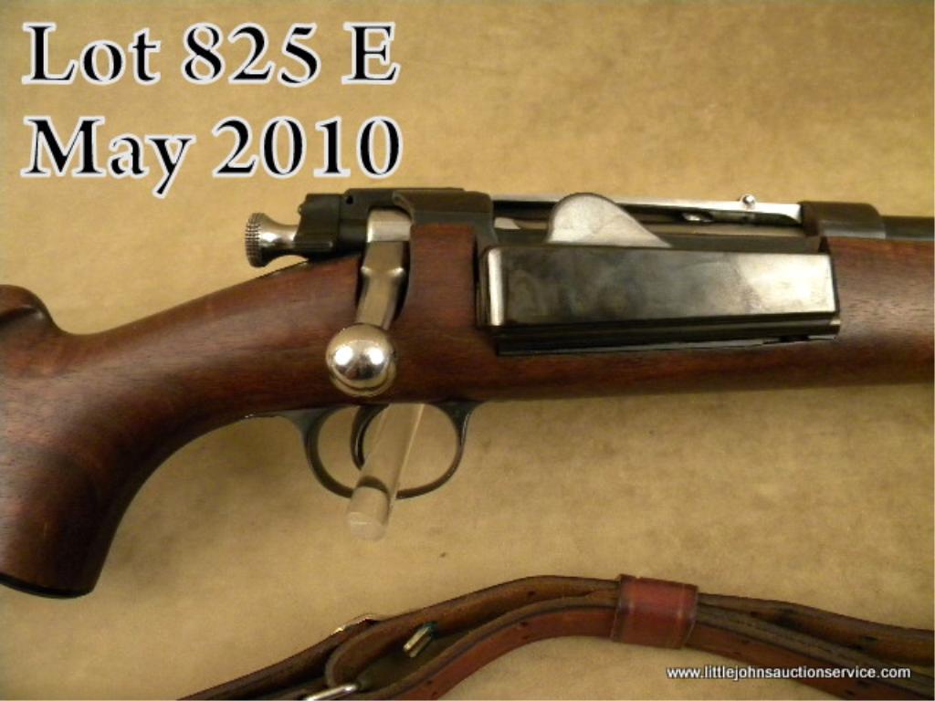 Sporterized Model 1898 US Krag bolt-action rifle, appears to be 30-40 Krag cal., 23” round barrel, re-blued finish, re-stocked, #452889. This gun is in overall fair + condition showing the majority of the older re-blue; fair bore, good action,upgraded sights, receiver tapped for scope mounts; overall good custom stock with nice graining, Monte Carlo cheek piece, hard rubber butt pad added, leather Hunter brand sling. Est.: $150-$300.