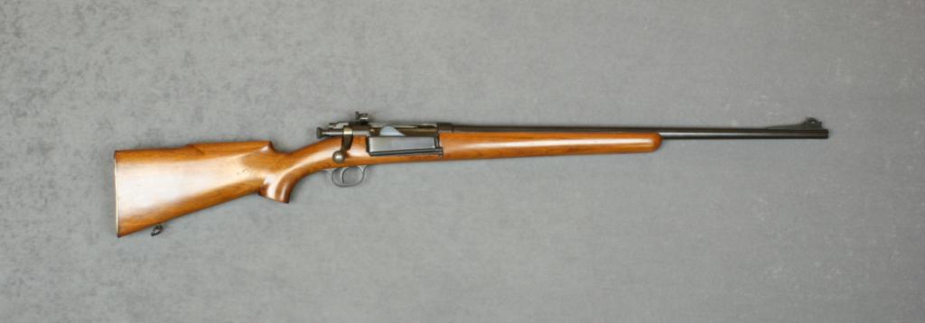 Sporterized Model 1898 bolt-action Krag  rifle, .30-40 cal., 24” barrel, mat black  finish, custom wood stock, #365530. This gun  is in overall very good condition as  refurbished with note from consignor that the gun was sporterized in 1945 by John Goodlad,  Sr. with new barrel, stock, sights and front  sight ramp made with a file (expertly  accomplished); fine bore, action and custom  wood stock.   Est.:  $125-$225.
