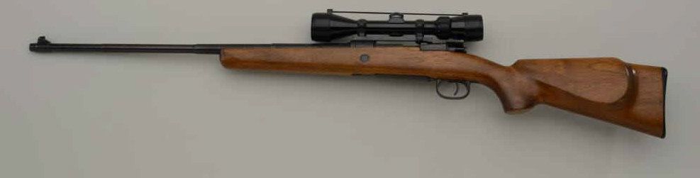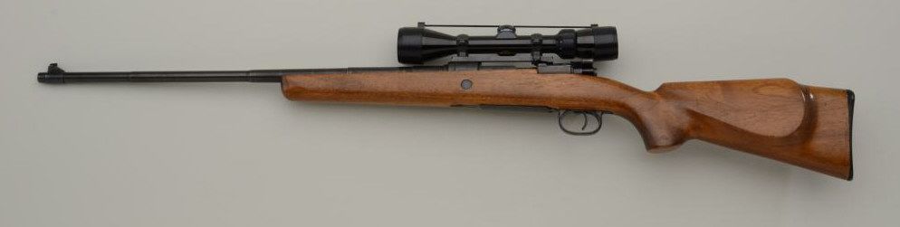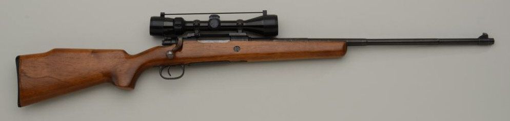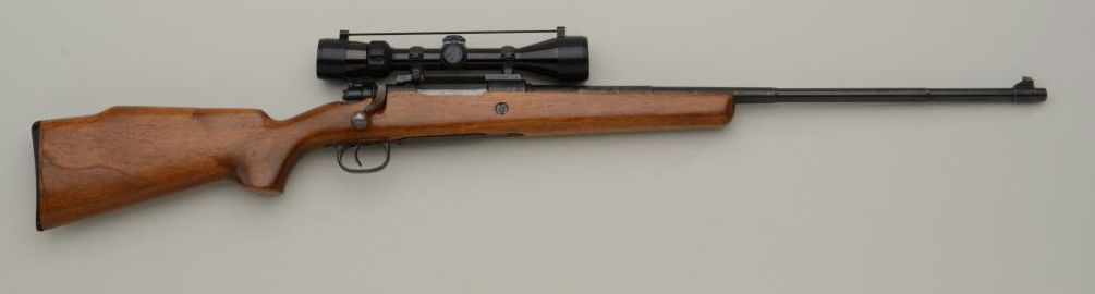 Sporterized Model 98 Mauser utilizing World War II era action and barrel with Nazi proofs, serial number 19328. The bolt handle has been turned. A handmade stock has been added which is somewhat crude and markedBishop. The metal shows 50% thinning original military blue finish. A Bushnell 3 to 9 power scope on Leopold mounts has been added and the bore is good. The action is somewhat rough. The trigger release is good. Est.:$150-$300.