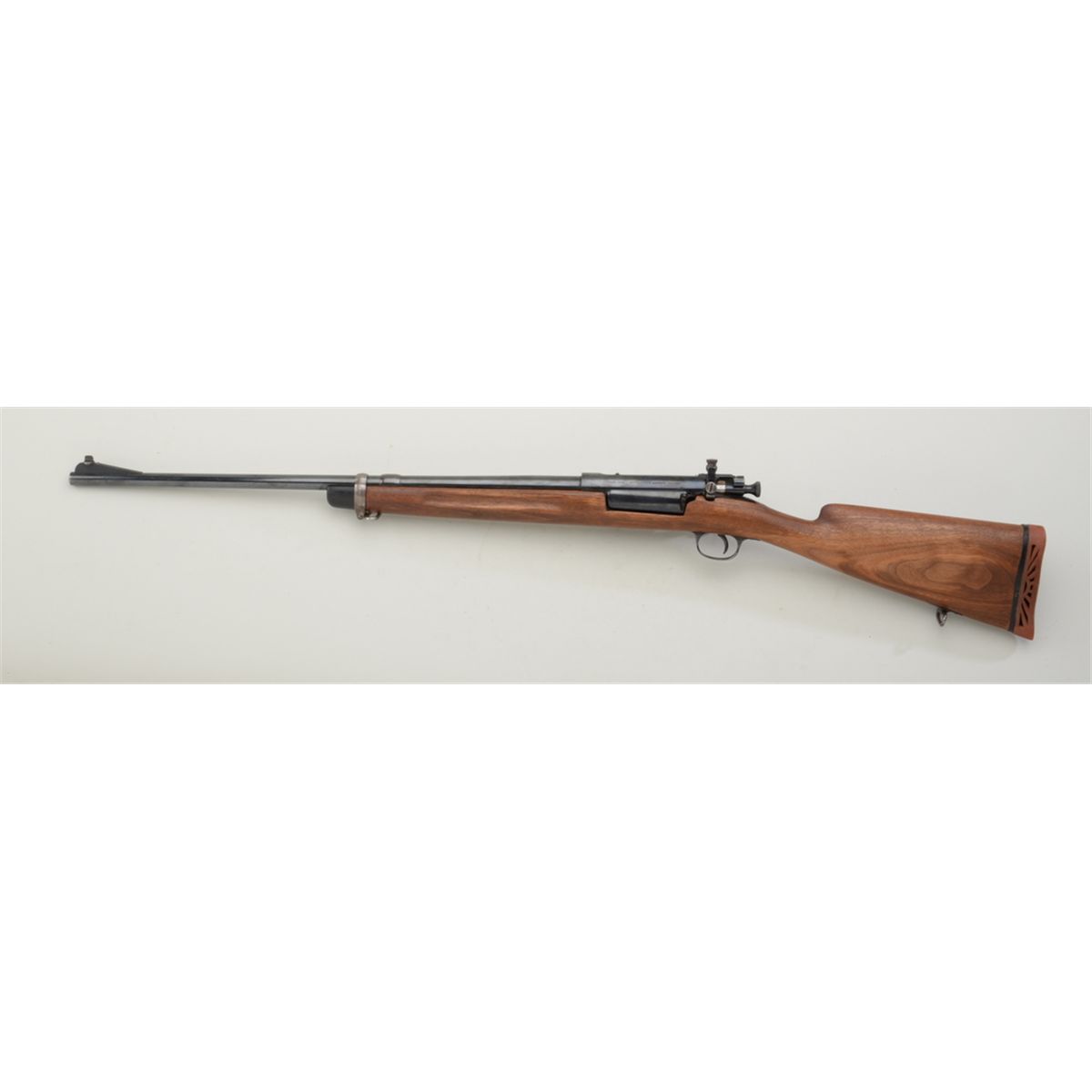 Sporterized Springfield Armory U.S. Model 1898 Krag bolt-action rifle, .30-40 Krag cal., 24” barrel, re-blued finish, wood stock, red hard rubber butt pad, sling swivels, #253773. This gun is in overall good condition as Sporterized and refinished, fair bore, crisp action, overall good wood stock, adjustable receiver mounted sight and ramp front sight. Est.: $300-$500.