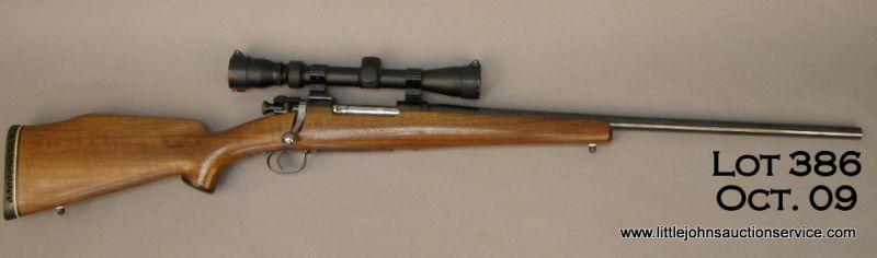 Sporterized Springfield Model ’03 bolt-action rifle, appears to still be .30 cal as the muzzle of the barrel shows the flaming bomb proof, date of 5-44 and initials H.S., re-blued finish, custom wood stock, #4718888. This gun is in overall very good condition as customized with a very good bore, action and sling swivel eyelets; mounted with a Tasco scope. Est.: $200-$400.