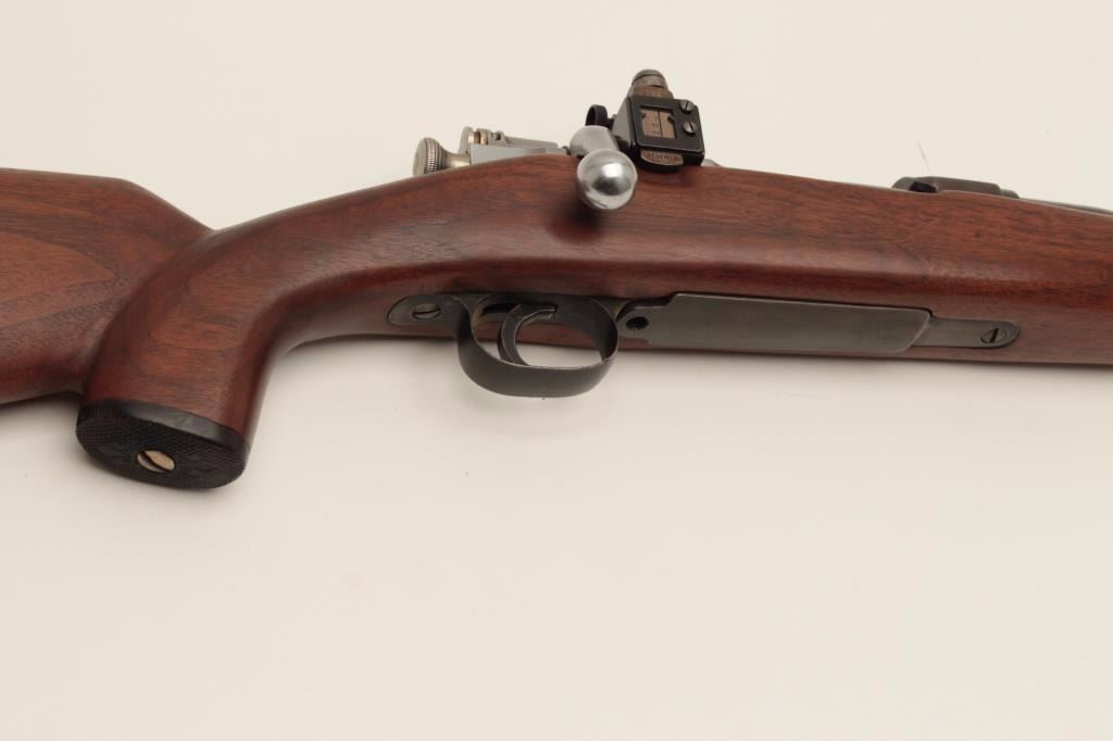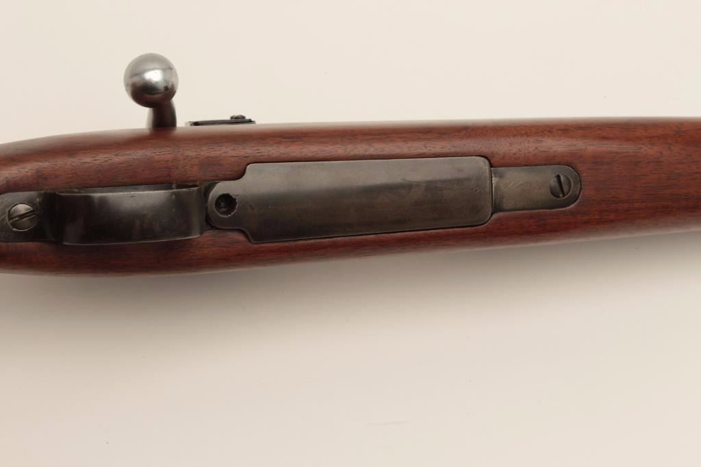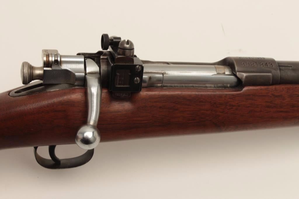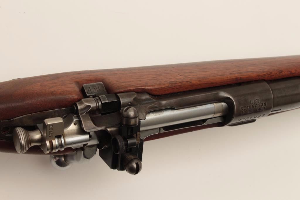 Sporterized U.S. Model 1903 Remington bolt action rifle, .30 caliber, 24.5” barrel, blued re-finish, Redfield adjustable receiver sight, custom wood stock, S/N 3081843, in overall good to very good condition with avery good bore, crisp action, good markings and very good wood stock. (C&R). Est.: $300-$600.