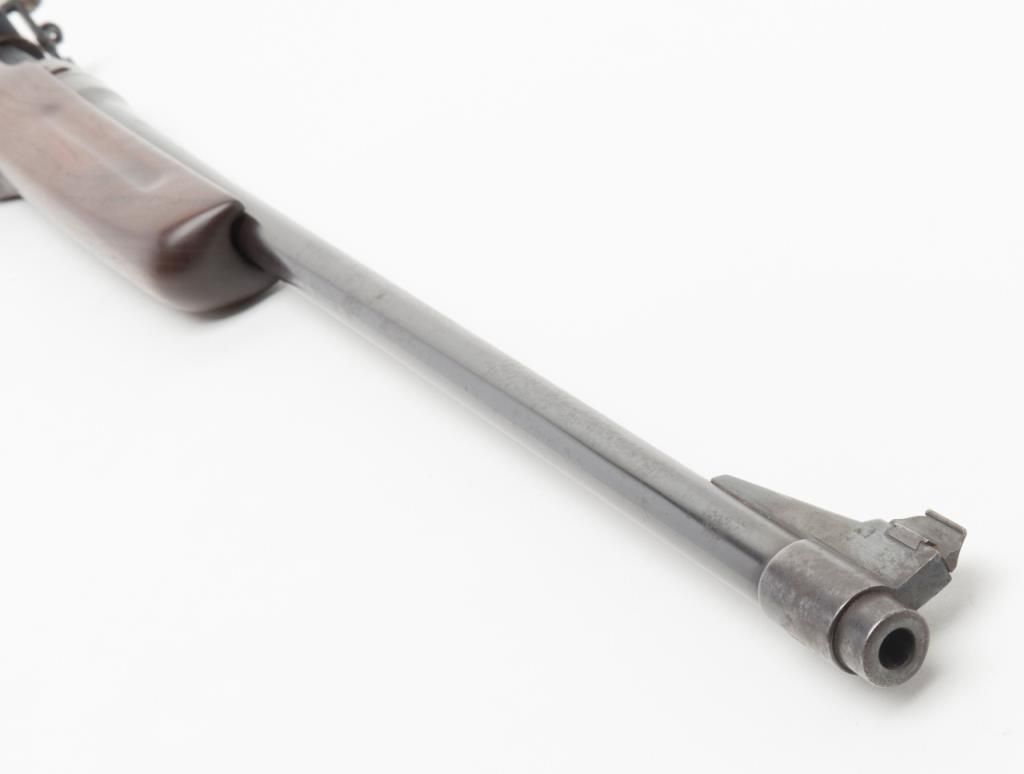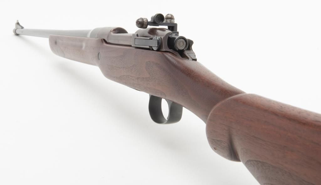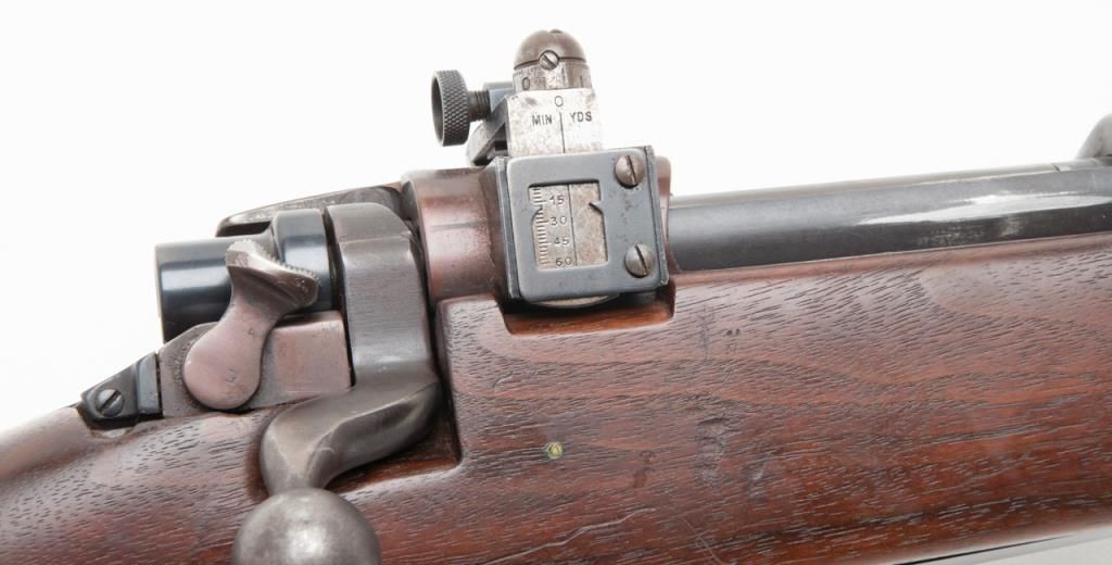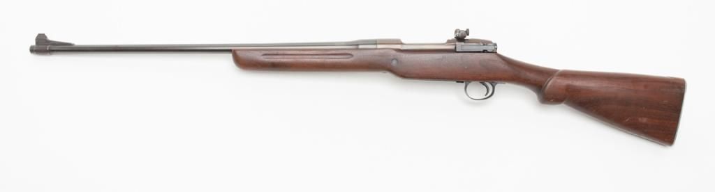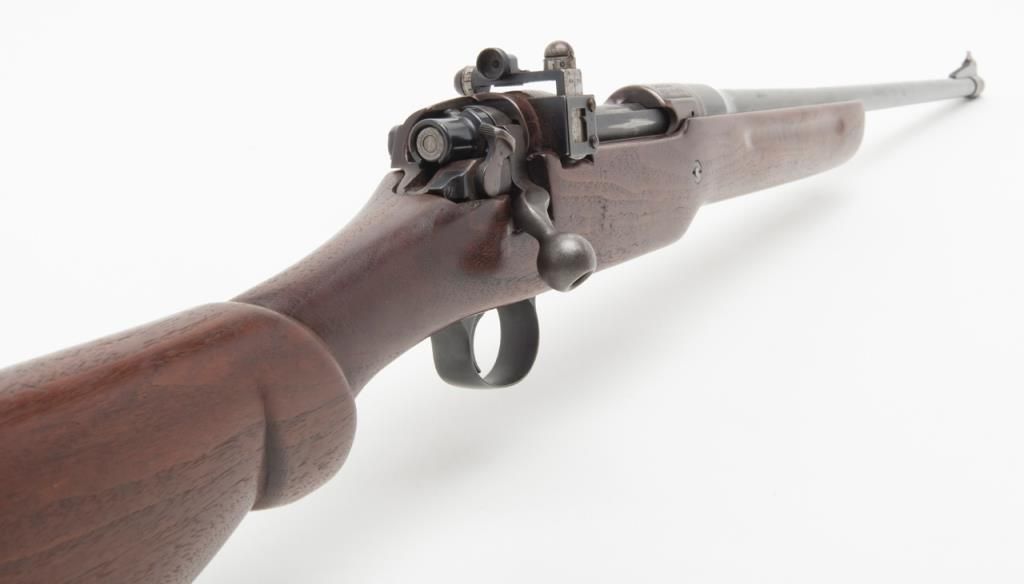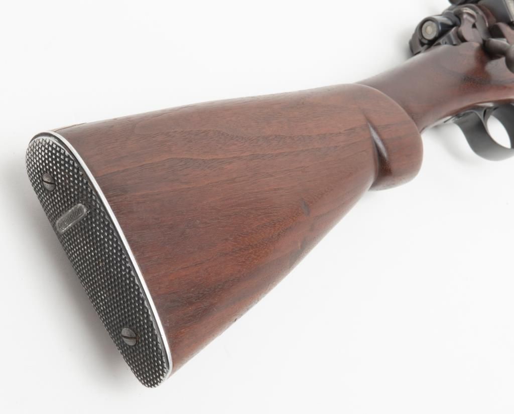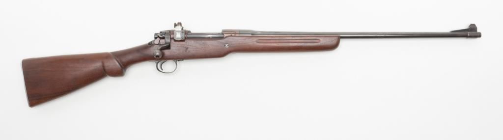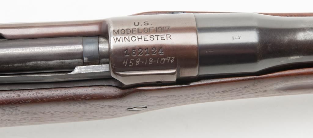 Sporterized U.S. Model 1917 bolt action rifle, .30-06 cal., 25” barrel, re-blued finish, re-stocked with checkered steel Remington butt plate, #162124 in overall good condition with Social Security number etched into the receiver,good bore, action and markings, good replaced stock; added adjustable Lyman receiver-mounted sight. (C&R/PPT). Est.: $300-$600.