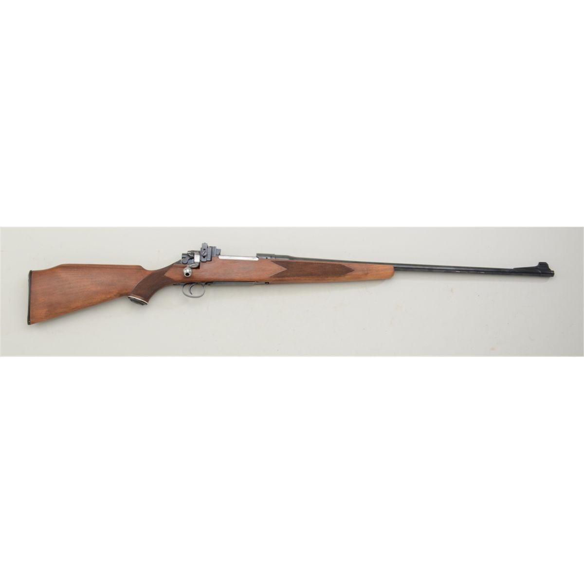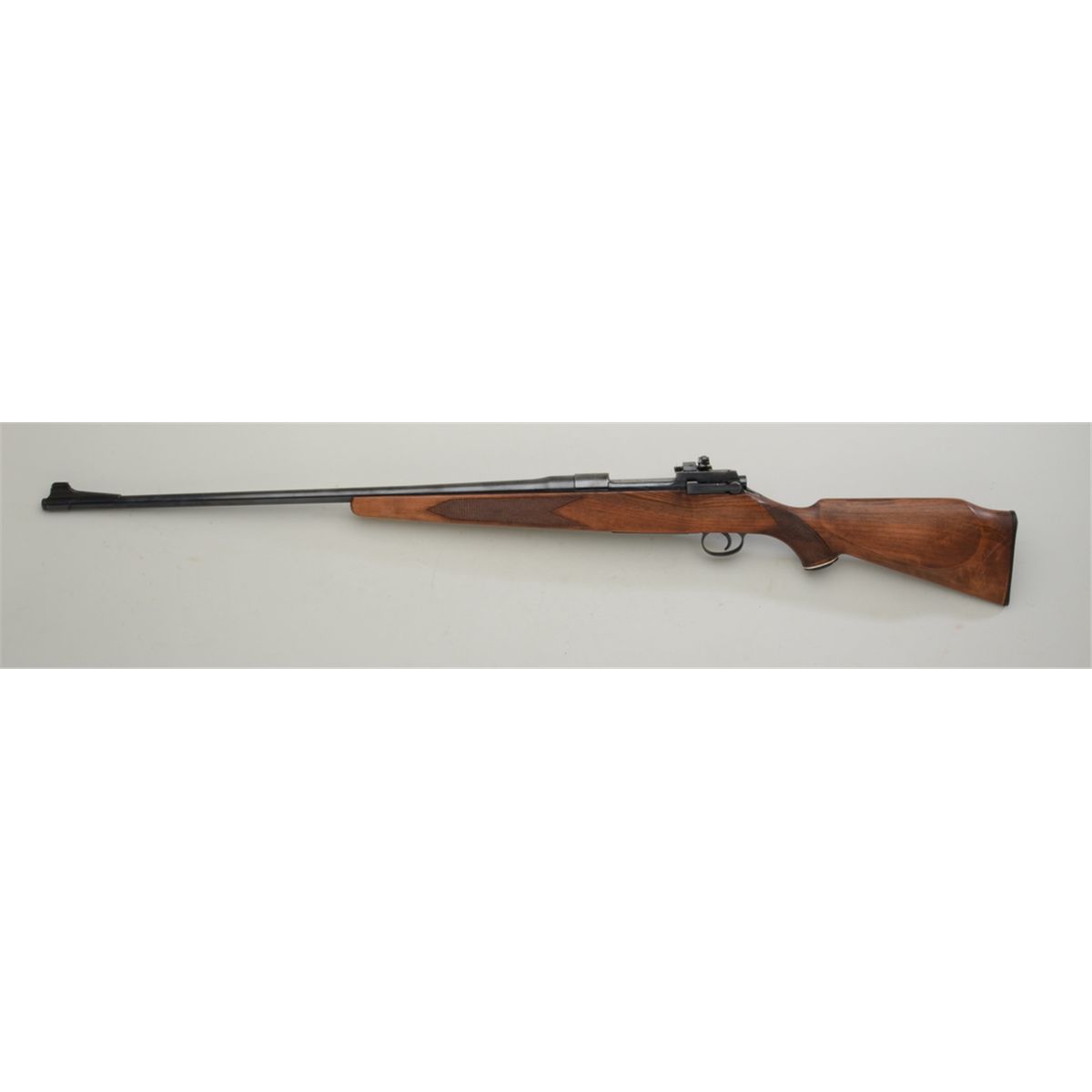Sporterized U.S. Remington Model 1917 bolt-action rifle, .30-06 cal., 26” barrel, re-blued finish, checkered custom wood stock, adjustable Pacific receiver sight, #571444. This gun is in overall very good condition as sporterized with a very good bore, crisp action, majority of finish remaining, fine wood stock with nice graining and style. Est.: $175-$350.