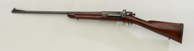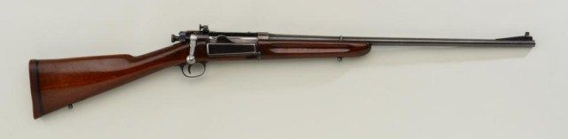 Sporterized U.S. Springfield Krag Model 1898 bolt-action rifle, .30-40 Krag cal., 23” barrel, re-blued finish, wood stock, added hard rubber butt pad, #389205. This gun is in overall good condition as modified showingthe majority of its re-finish, good bore, crisp action, good markings, overall good re-finished wood stock; added adjustable Redfield receiver mounted rear sight. Est.: $300-$600.