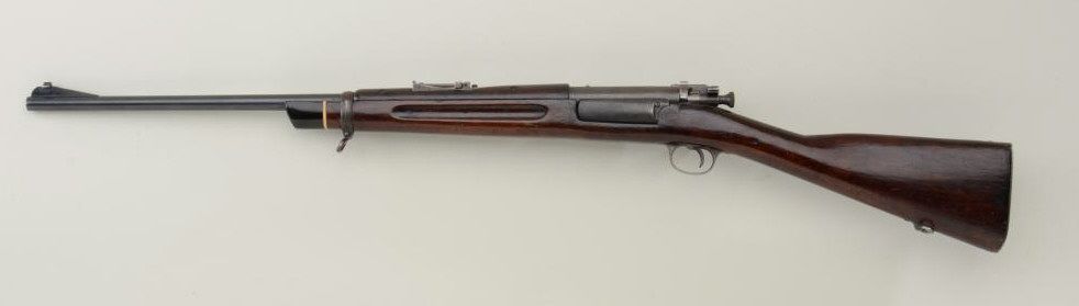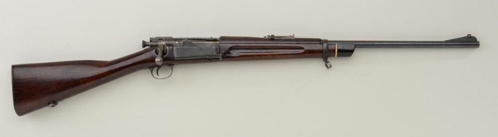 Sporterized U.S. Springfield Krag bolt-action rifle, Model 1896, .30-40 Krag cal., 24” barrel, re-blued finish, sporterized stock, #86864. This gun is in overall good condition showing a plum brown patina on metalsurfaces, fair bore, crisp action, good markings, wood is good with usual dings and mars and has been long ago re-varnished. Est.: $150-$300.