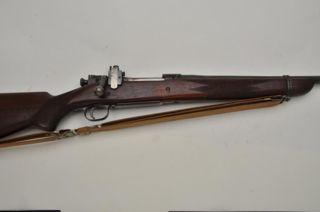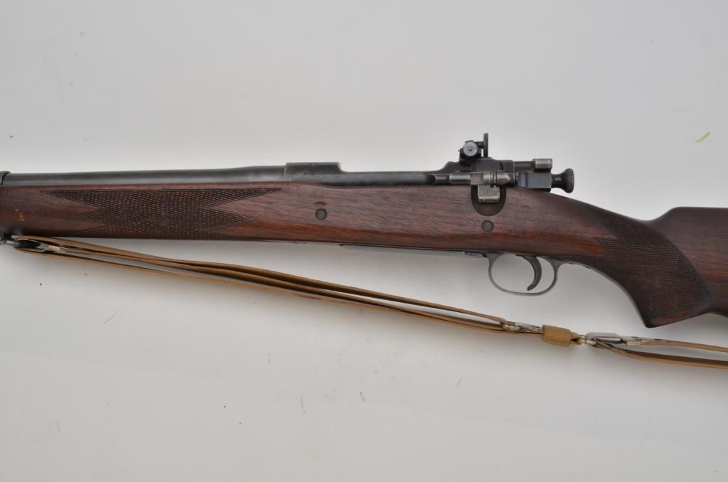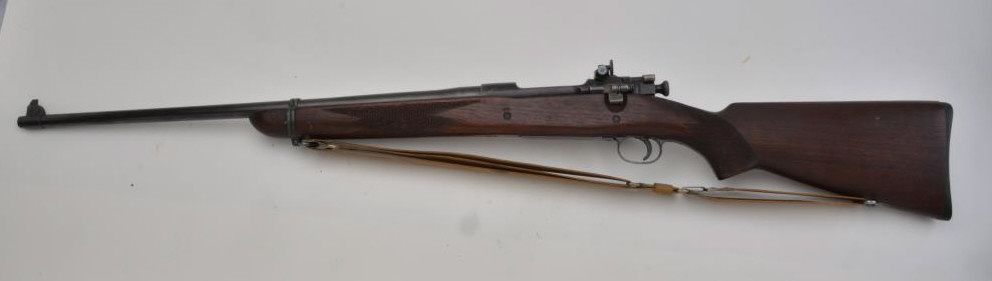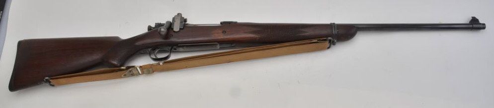 Sporterized U.S. Springfield Model 1903 bolt action rifle, .30-06 cal., 24” S.A. barrel dated 3-12, Lyman adjustable receiver sight, checkered wood half stock with woven sling, #500172. This gun is in overall goodcondition as modified with a good bore, crisp action and good wood stock with checkered metal butt plate. From an old estate. Est.: $300-$600.