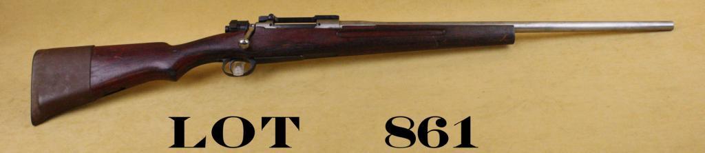 Sporterized custom bolt- action rifle with receiver married with a modern steel barrel assembly in 45-70 cal., 24” round barrel, #95282. This is currently a parts gun only as the action is not working and the frameshows a strong cleaning but remnants of an Arisaka Arsenal marking on the left side; bore is good as is the shortened stock with some scattered mars and scratches. Est.: $125-175.