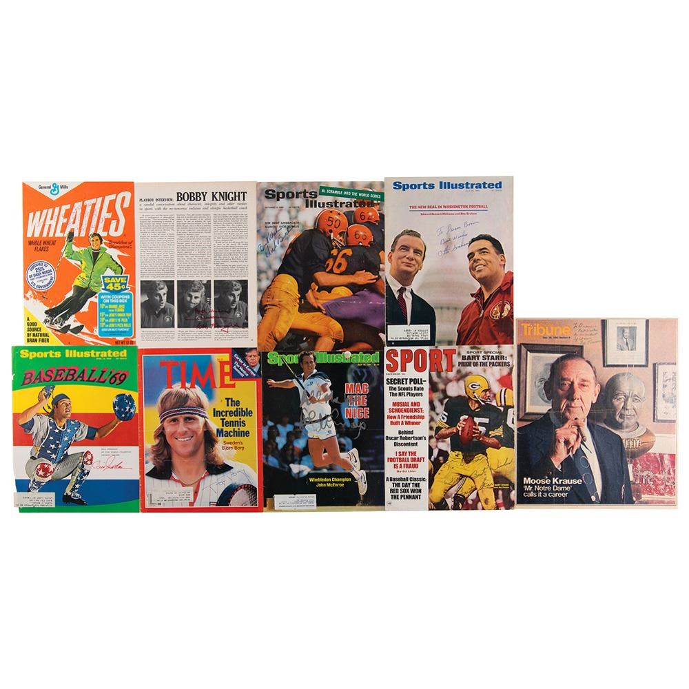 Group lot of nine items, mostly magazine front covers, individually signed in ink and felt tip by a notable athlete or coach, including: Bjorn Borg, Dick Butkus, Bill Freehan, Otto Graham, Bobby Knight, Moose Krause, John McEnroe, Bob Richards (Wheaties cereal box), and Bart Starr. In overall very good to fine condition, with general creasing and mailing folds.