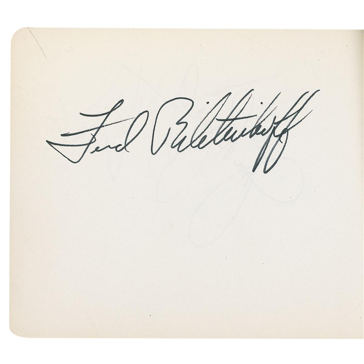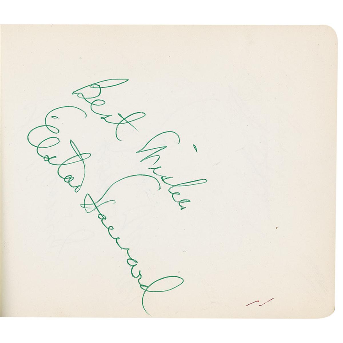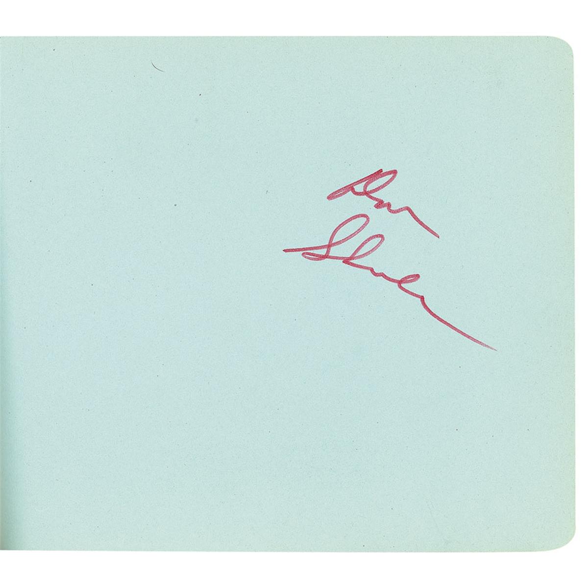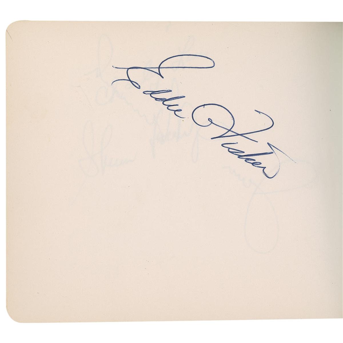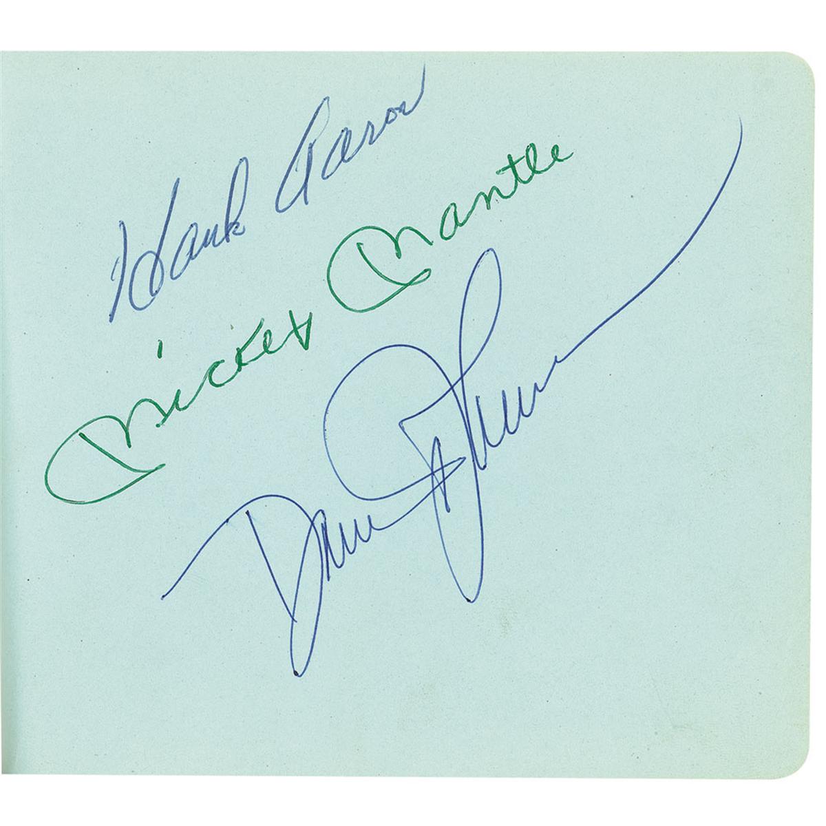 Vintage autograph album, 6 x 4.75, with 100 ink signatures inside, several inscribed, some multi-signed pages, and most back to back. Signers include: Mickey Mantle, Hank Aaron, Harmon Killebrew, Bob Gibson, Elston Howard, Joe Garagiola (2), Bobby Richardson, Charley Lau, Pete Rose, Fred Biletnikoff, Frank Crosetti, Joe Pepitone, Tony Oliva, Jim Kaat, Jim Orr, Don Shula, Mudcat Grant, Denny McLain, Ralph Houk, Clete Boyer, Al Downing, and Eddie Fisher. Signatures themselves are in fine condition. The album itself rates very good overall. Accompanied by four postcards signed on the back by Joe Frazier (one ins).
