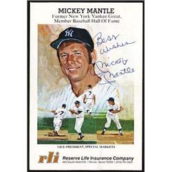 COLLECTIBLES Sports Baseball Autographs Mickey Mantle Autograph Inscribed "Best Wishes" in blue ball point ink on a 4x6" color card from the Reserve Life Insurance Co. Horizontal fold does not affect signature or inscription. Very attractive appearance. Estimate US$150-250