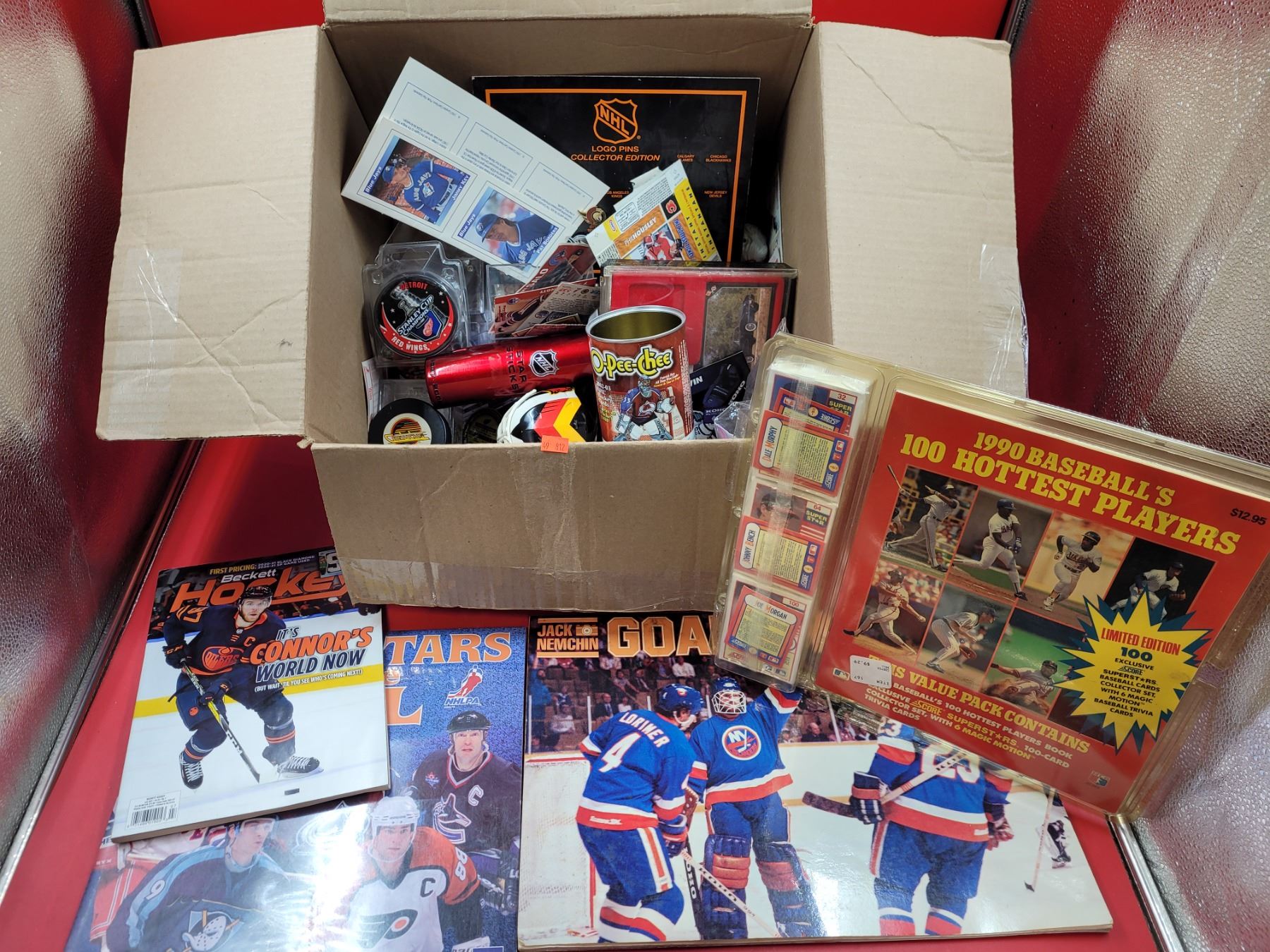 Sports Collectible Lot w/ 1990 Baseball Card & Book Set, Pucks, Cards, & More