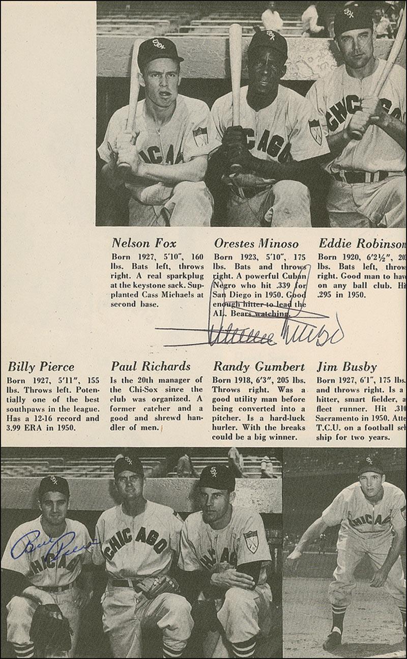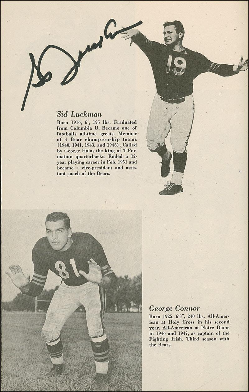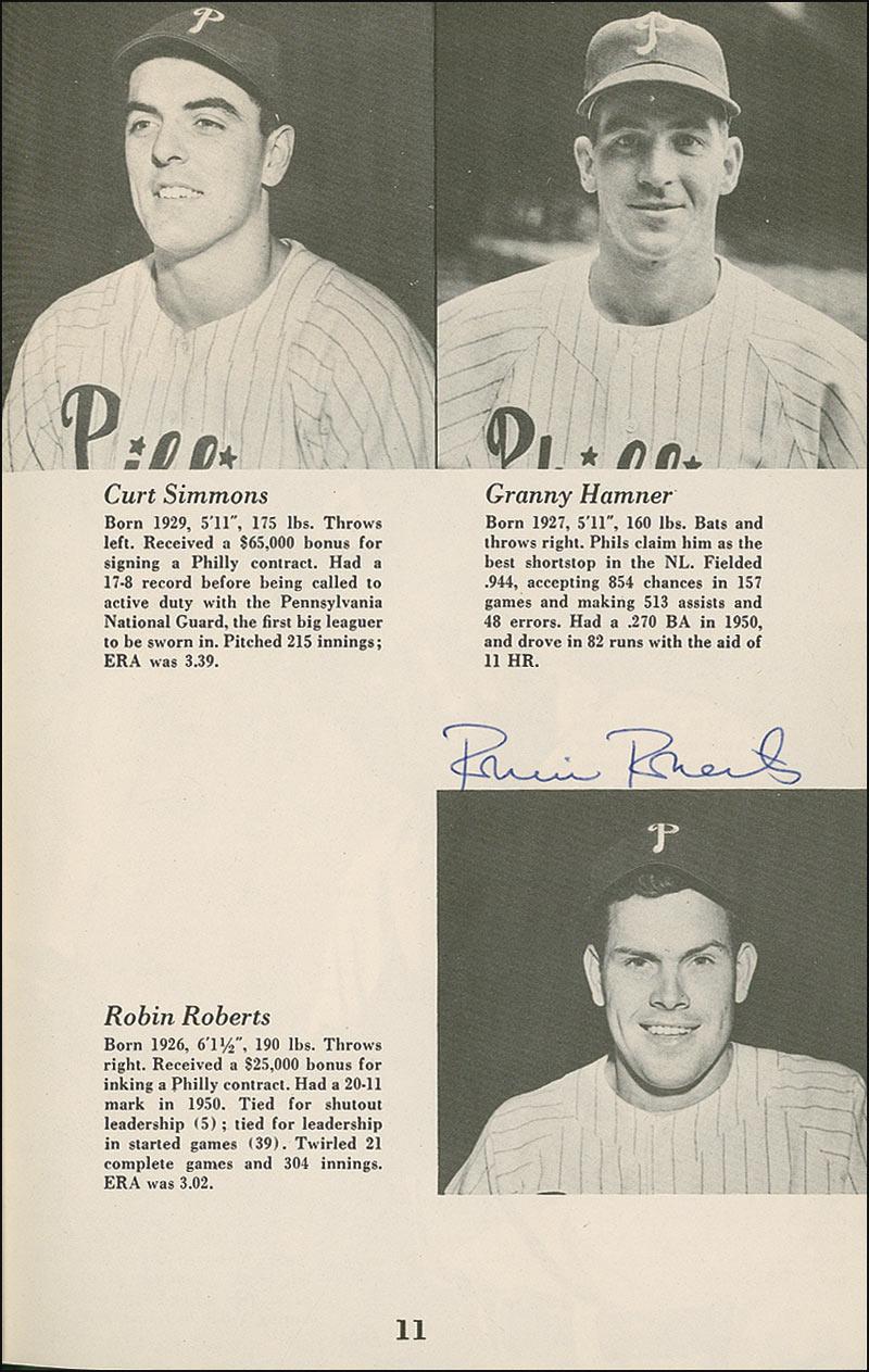 Signed book: Sports Photo Album. First edition, first printing. NY: David McKay Company, 1951. Hardcover with dustjacket, 6.25 x 9.5, 167 pages. Signed inside under their respective pictures by 11 sports greats from baseball, football, and basketball. Signers are: Robin Roberts, Duke Snider, Minnie Minoso, Chico Carrasquel, Hoot Evers, Johnny Groth, Sid Luckman, Otto Graham, Ken Kavanaugh, Larry Coutre, and Bob Lavoy. In fine condition, with some mild toning to pages and pastedowns. Dustjacket has several tears, light soiling, and a small label affixed to back.