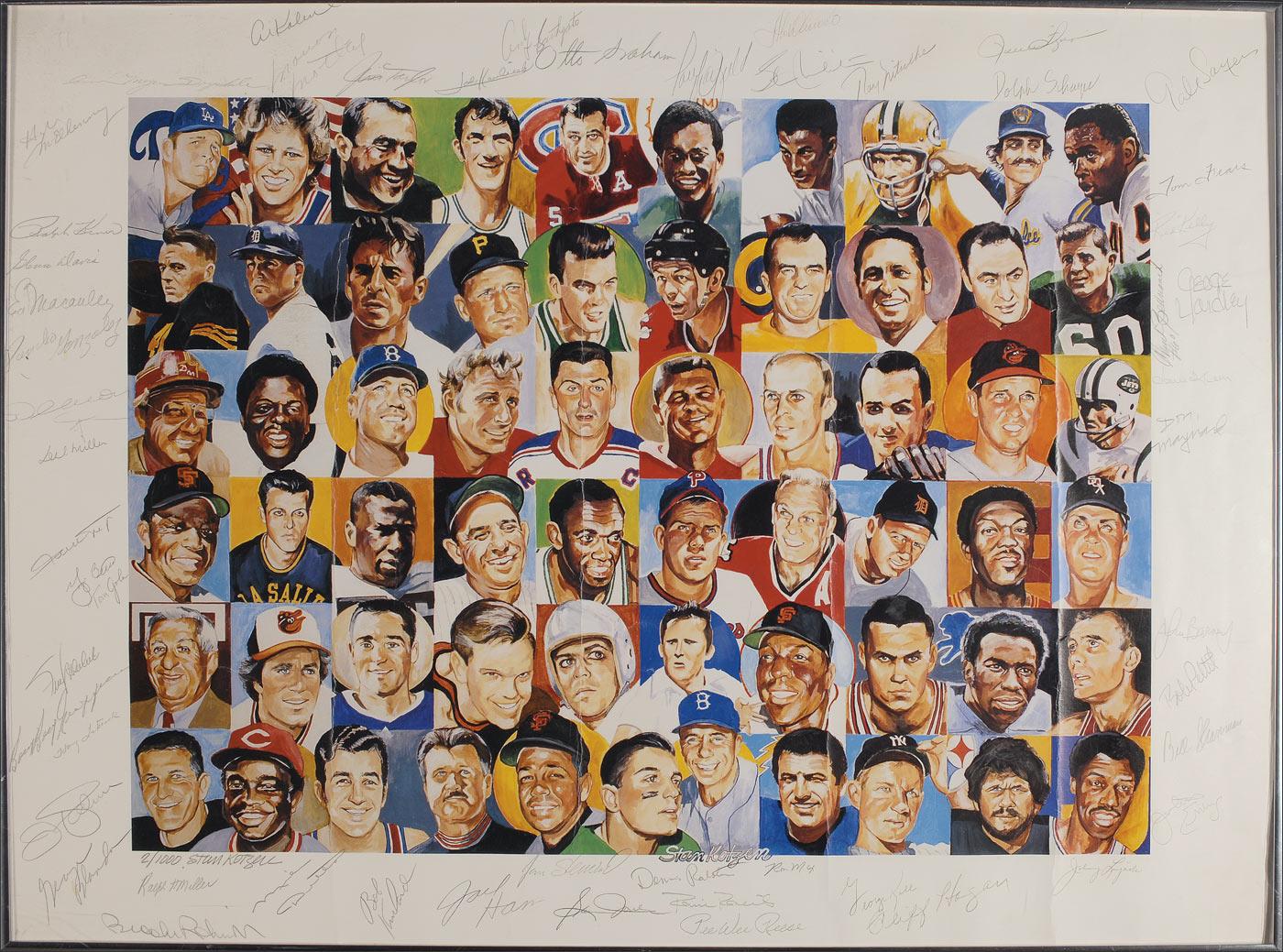 Color limited edition 31.5 x 23.5 lithograph, numbered #2/1000, signed in pencil by 53 Hall of Famers. Signers include: Anne Meyer, Al Kaline, Jim Taylor, John Havlicek, Otto Graham, Paul Warfield, Stan Mikita, Ray Nitschke, Rollie Fingers, Dolph Schayes, Gale Sayers, Red Kelly, Don Maynard, Bob Pettit, Bill Sharman, George Kell, Pee Wee Reese, Robin Roberts, Stan Jones, Jan Stenerud, Jack Ham, Mike Ditka, Brooks Robinson, George Blanda, Jim Palmer, Yogi Berra, Willie Mays, Deacon Jones, and Ralph Kiner. Also signed by artist Stan Kotzen. Framed to an overall size of 32.5 x 24. In very good to fine condition, with several vertical creases. Accompanied by a full letter of authenticity from PSA/DNA. Oversized.