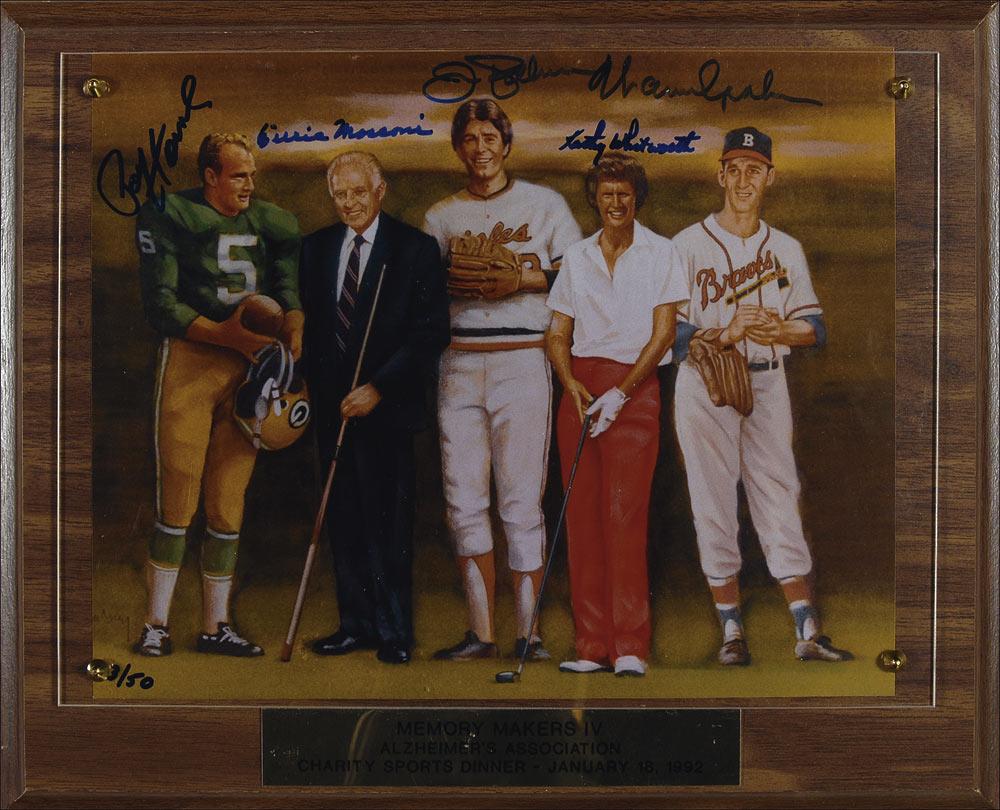 Limited edition color satin-finish 10 x 8 photo of a print made for the Alzheimer’s Association Charity Sports Dinner in 1992, #13/50, featuring attendees Paul Hornung, Willie Mosconi, Jim Palmer, Kathy Whitworth, and Warren Spahn, signed in blue felt tip by all five. Photo is presented on a wooden plaque behind Lucite along with a name plaque, to an overall size of 13 x 10.5. In fine condition, with a light brush to Palmer’s last name. Pre-certified Steve Grad/PSA/DNA and RRAuction COA.