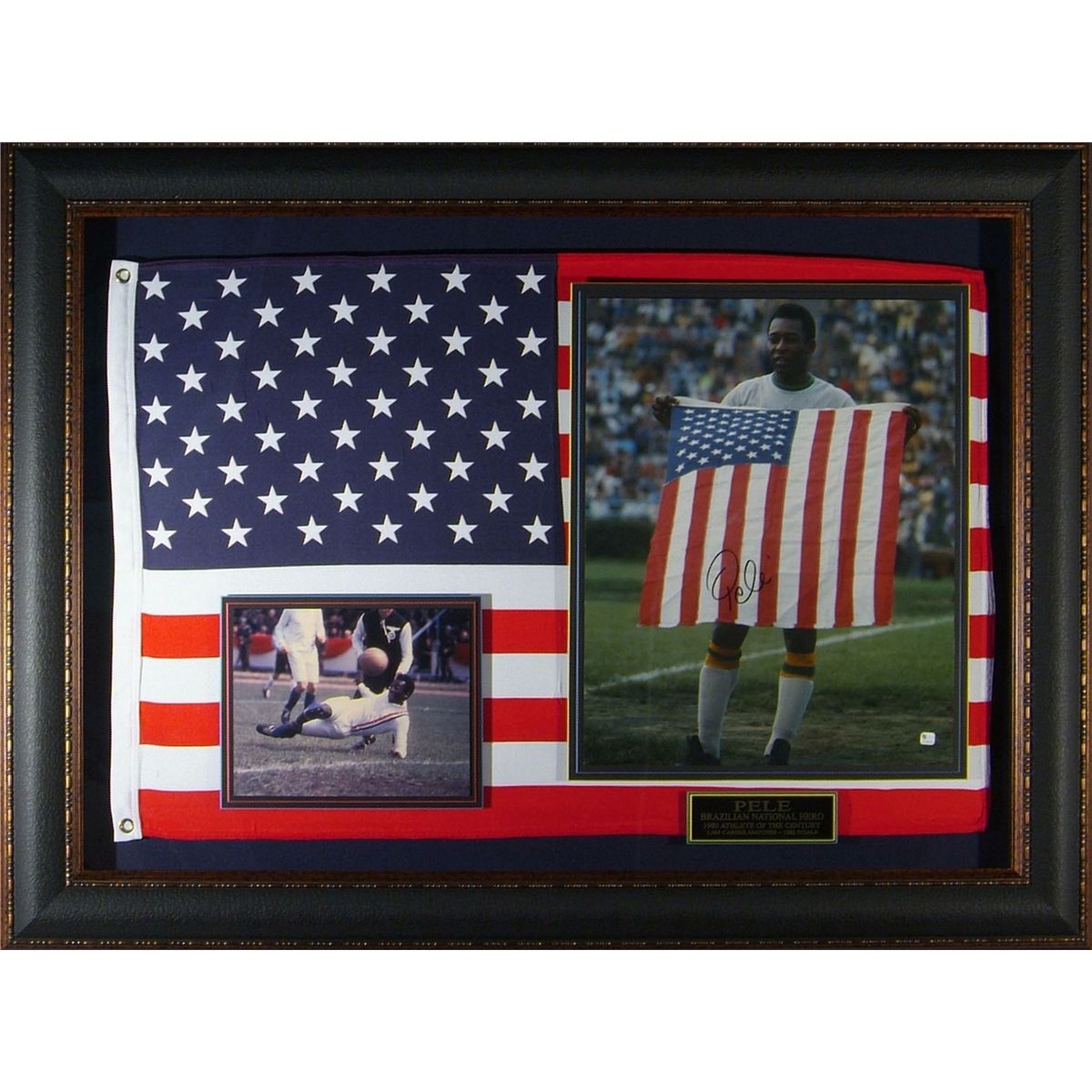 Sports: PELE: Pele signed 11x14 holding American flag. Piece includes 18x24 American flag and various pictures of Pele.