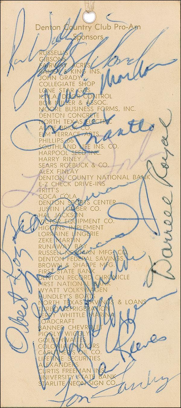 Blue ballpoint signatures of 13 star athletes on the reverse of an off-white 2.5 x 5.75 Denton Country Club Pro-Am golf pass. Signers include Mickey Mantle, Dan Reeves, Tom Landry, Darrell Royal, and Lee Roy Jordan. In fine condition with light toning and Jordan’s signature a bit faded.