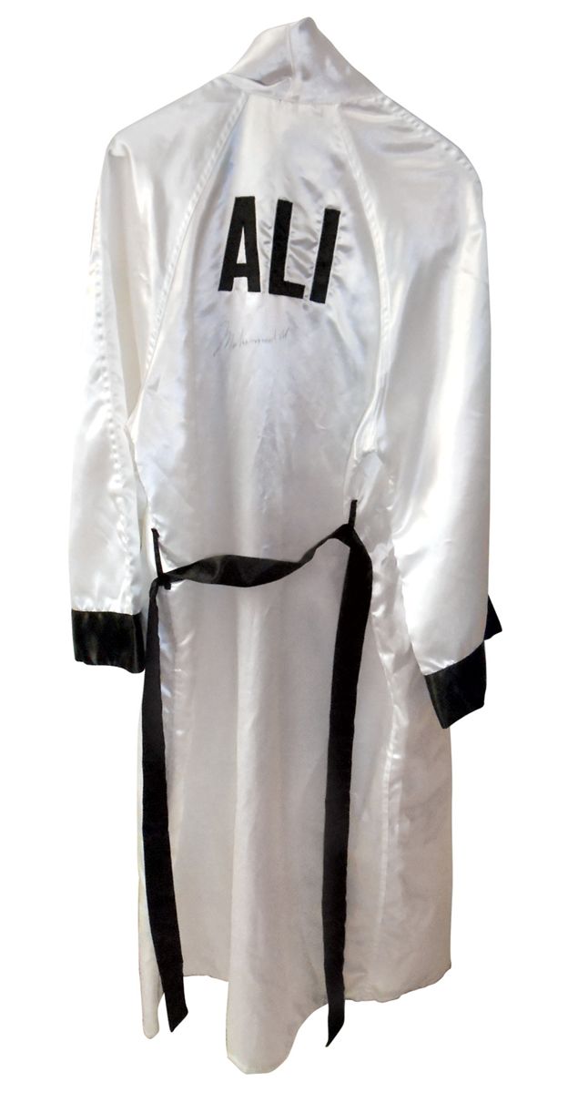 Sports, boxing, autographed boxing robe, Muhammad Ali twice signed, Everlast "ALI" boxing silk, signatures obtained in person by Steve Pilchen, Exc cond, size 44.