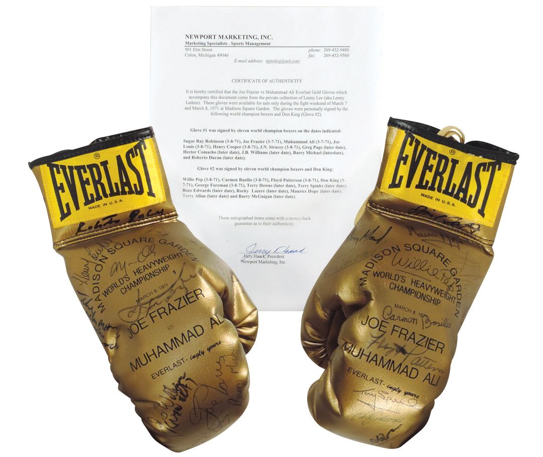 Sports, boxing gloves & certificate (3), Joe Frazier vs. Muhammad Ali, Mar 8, 1971 at Madison Square Garden, signed by World Championship Boxers Joe Frazier, Muhammad Ali, Sugar Ray Robinson, Joe Louis, Henry Cooper, J. N. Stracey, Greg Page, Hector Comacho, J. B. Williams, Barry Michael, Roberto Duran, Willie Pep, Carmen Basilio, Floyd Patterson, George Foreman, Terry Downs, Terry Spinks, Bozo Edwards, Rocky Lazere, Maurice Hope, Terry Allan, Barry McGuigan & promoter Don King, accompanying certificate of authenticity from Newport Marketing, Inc. w/signature guarantee, all Exc cond, 11.5"L.