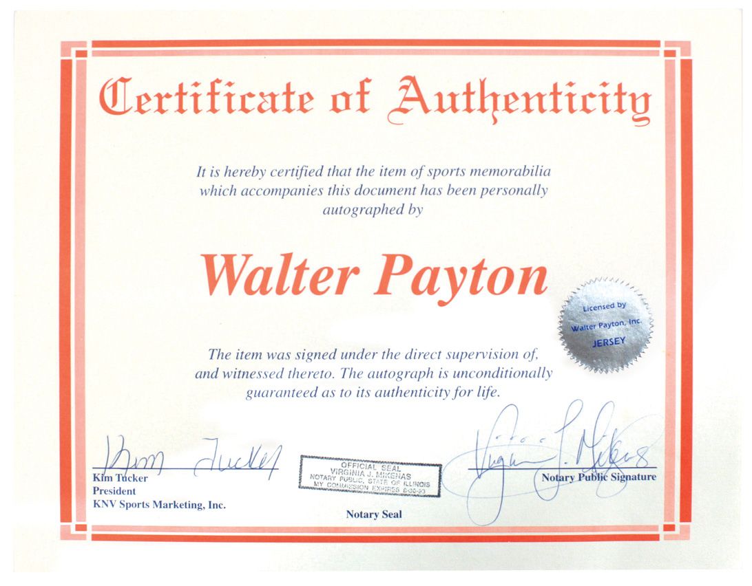 Sports, football, autographed jersey, signed "Sweetness" & "Walter Payton 34", an authentic Wilson NFL game jersey w/Certificate of Authenticity, Licensed by Walter Payton, Inc., Exc NOS cond w/mfgrs tag, size 44.