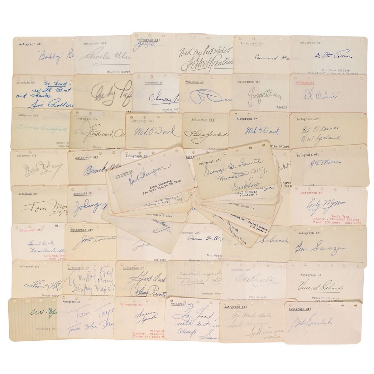 Collection of approximately 58 signatures of a diverse selection of sports figures, the vast majority in ink with a few in pencil, primarily on individual off-white 4.5 x 2.5 pages, some lined. Signers include: Jimmy Demaret, Gene Sarazen, Bronko Nagurski, Maxie Rosenbloom, Sam Snead, Warren Spahn, Gabby Street, Norm Van Brocklin, Esther Williams, Gar Wood, and Early Wynn. In overall fine condition, with light edge toning.