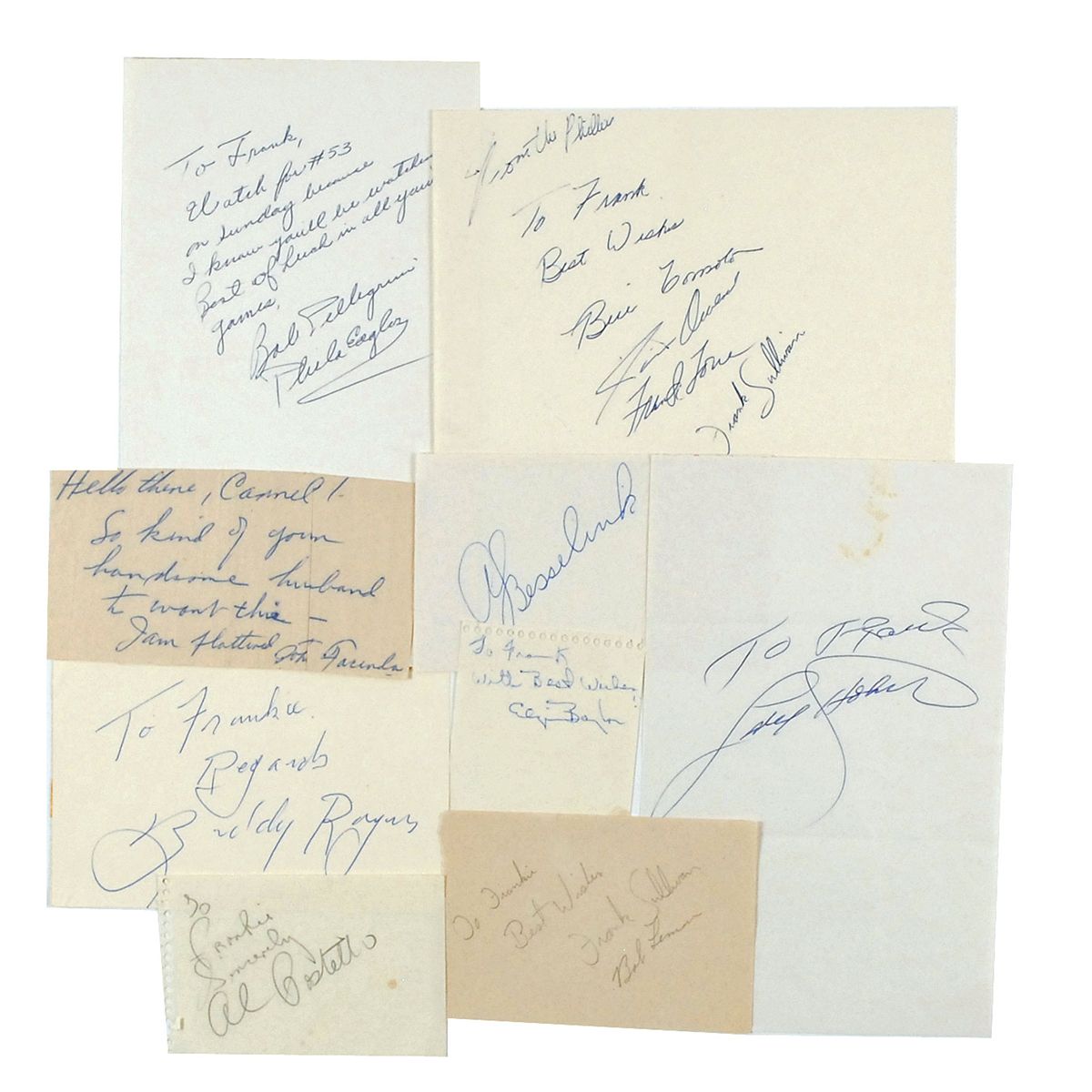 Collection of nine items, consisting almost entirely of signatures, each signed in ink by a famous athlete, many inscribed. Signers are: Al Besselink, Bob Pellegrini, Philadelphia Phillies (Billy Consolo, Jim Owens, Frank Sullivan, Frank Torre), Frank Sullivan, John Facenda, Al Costello, Buddy Rogers, Elgin Baylor, and Larry Holmes. In overall fine condition.
