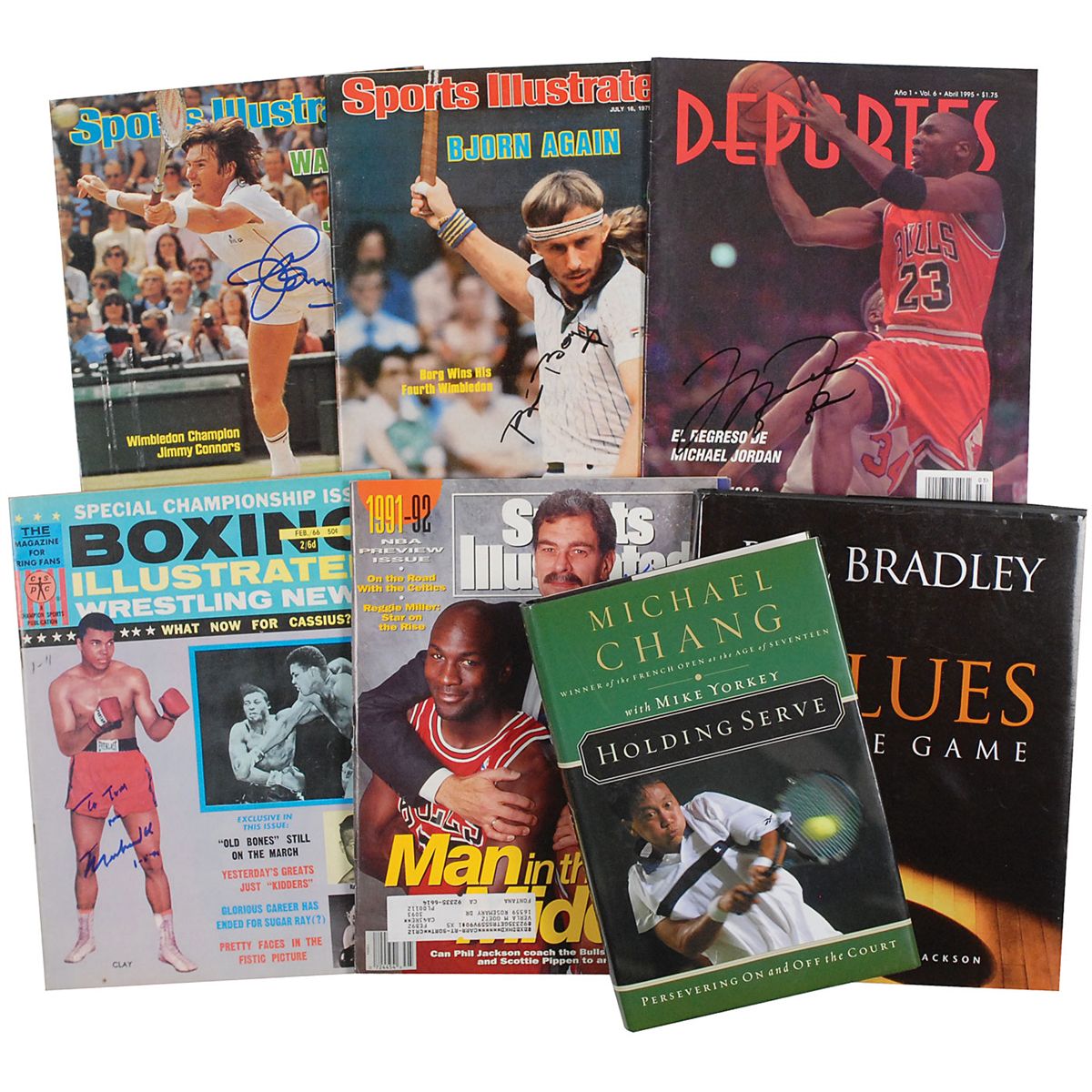 Seven items: Boxing Illustrated magazine, dated February 199, signed and inscribed on the front cover in blue felt tip by Muhammad Ali; Deportes magazine, dated April 1995, signed on the front cover in black felt tip by Michael Jordan and accompanied by a full letter of authenticity from PSA/DNA; three Sports Illustrated magazines, each signed on the cover in felt tip by the athlete or coach on the cover: Phil Jackson, Jimmy Connors, and Bjorn Borg; and two hardcover books, Holding Serve, signed and inscribed by Michael Chang and Values of the Game, signed by Bill Bradley and Phil Jackson. In overall fine condition.