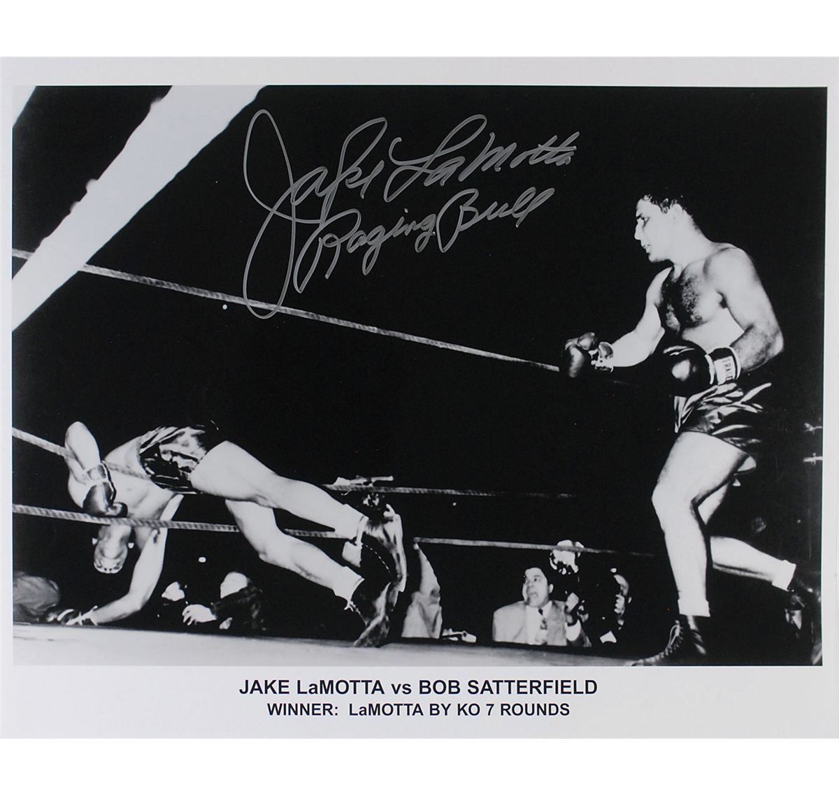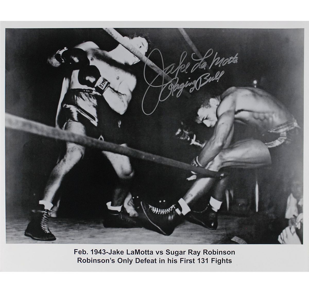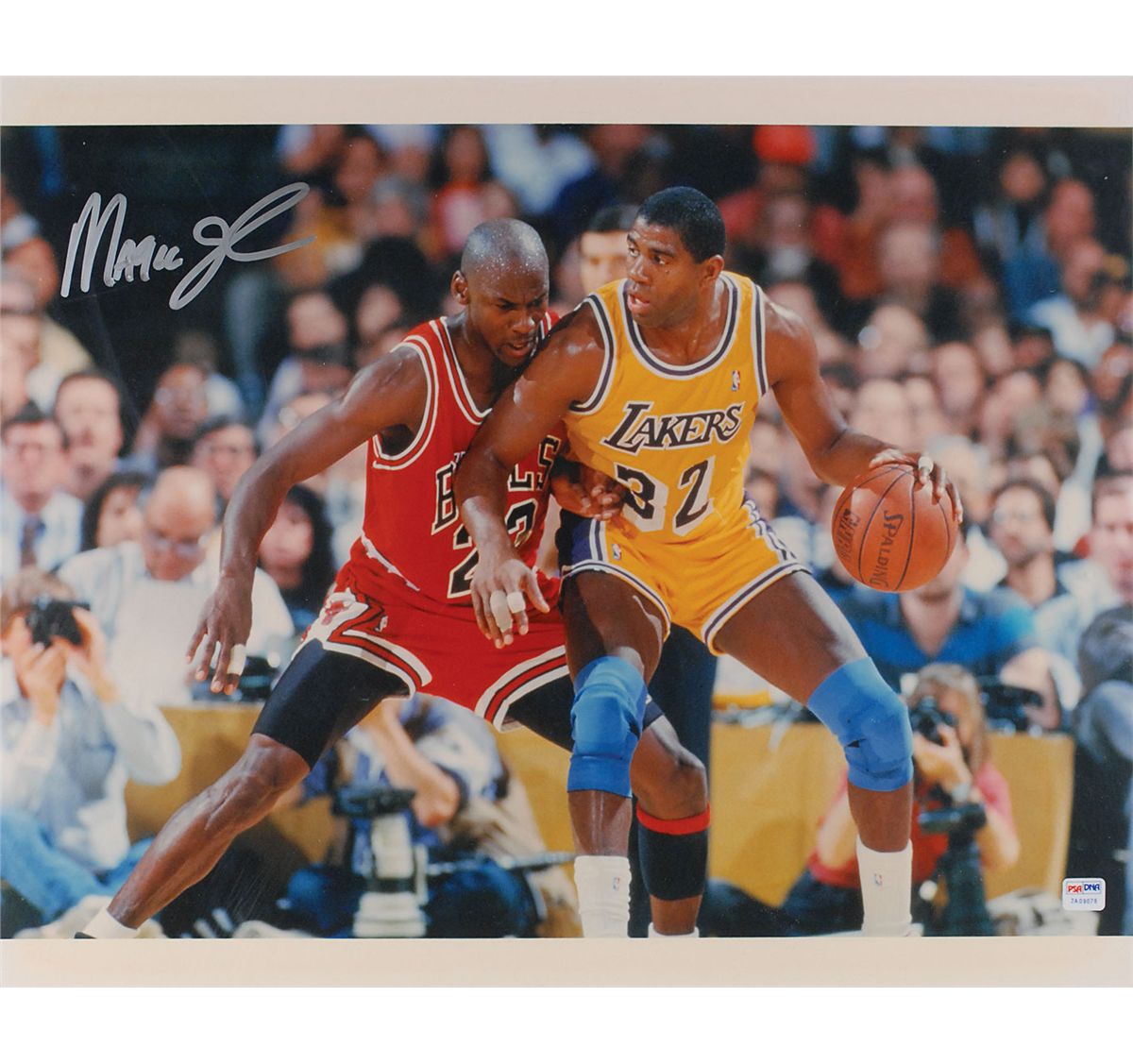 Seven oversized photos: color satin-finish 20 x 16 photo of Magic Johnson going up against Michael Jordan, signed in silver ink by Johnson; color satin-finish 16 x 20 photo of Magic Johnson’s celebration after receiving his 1992 Olympic gold medal, signed in silver ink; color satin-finish 16 x 20 photo of Tomlinson evading a tackle while playing for TCU, signed in blue felt tip; color satin-finish 20 x 16 photo of Love battling for a rebound during his stint at UCLA, signed in blue felt tip; and three classic glossy 20 x 16 photos of Jake LaMotta knocking Bob Satterfield out of the ring, signed in silver ink, “Jake LaMotta, Raging Bull." In overall fine condition, with a PSA/DNA label affixed to the first Johnson photo. Accompanied by the corresponding certificate of authenticity from PSA/DNA for the Johnson.