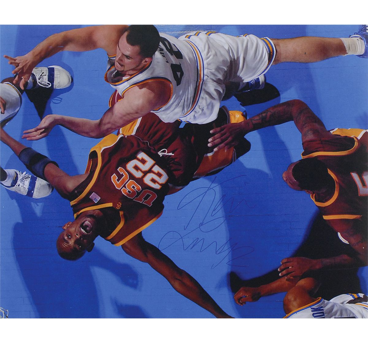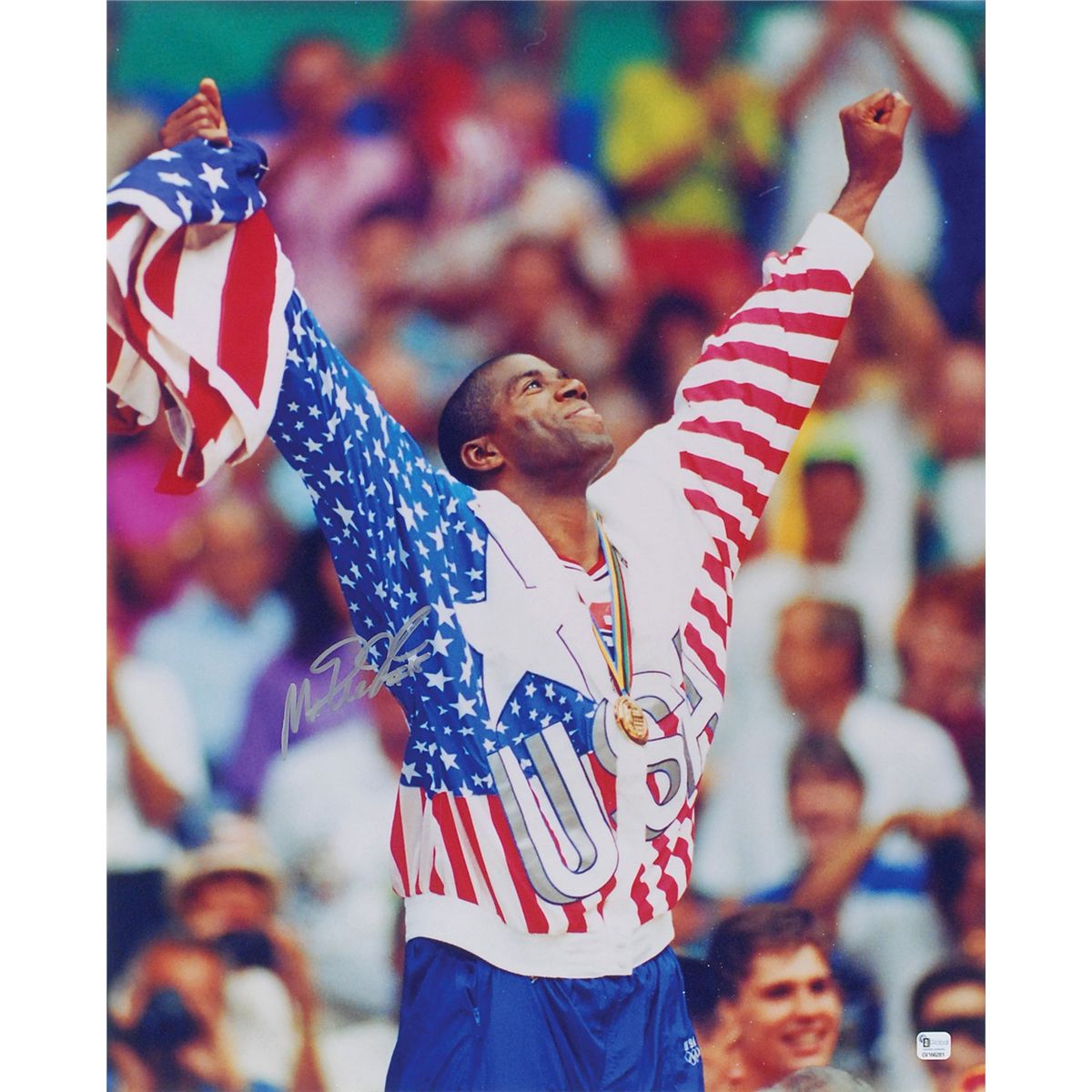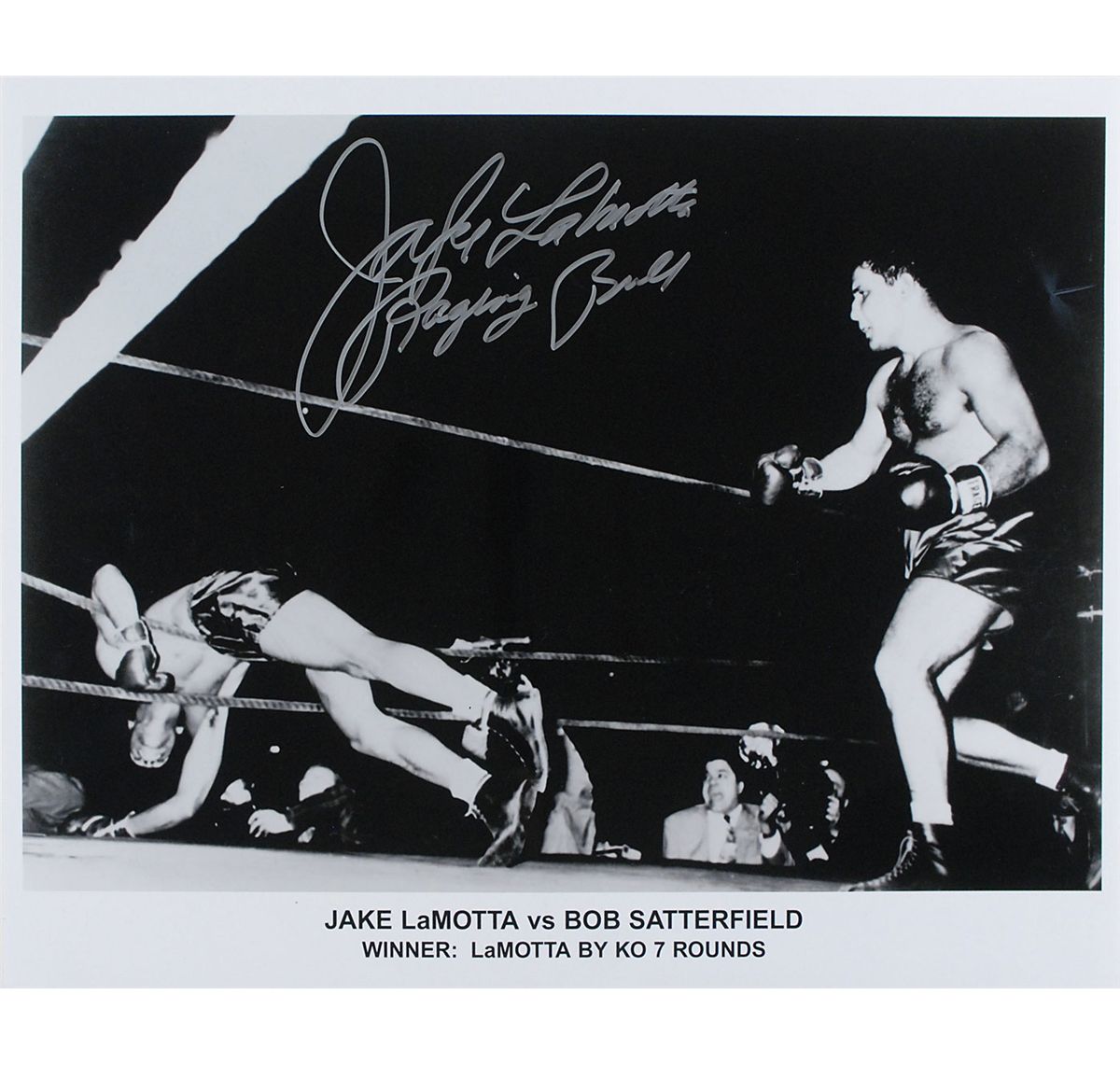 Seven oversized photos: color satin-finish 20 x 16 photo of Magic Johnson going up against Michael Jordan, signed in silver ink by Johnson; color satin-finish 16 x 20 photo of Magic Johnson’s celebration after receiving his 1992 Olympic gold medal, signed in silver ink; color satin-finish 16 x 20 photo of Tomlinson evading a tackle while playing for TCU, signed in blue felt tip; color satin-finish 20 x 16 photo of Love battling for a rebound during his stint at UCLA, signed in blue felt tip; and three classic glossy 20 x 16 photos of Jake LaMotta knocking Bob Satterfield out of the ring, signed in silver ink, “Jake LaMotta, Raging Bull." In overall fine condition, with a PSA/DNA label affixed to the first Johnson photo. Accompanied by the corresponding certificate of authenticity from PSA/DNA for the Johnson.