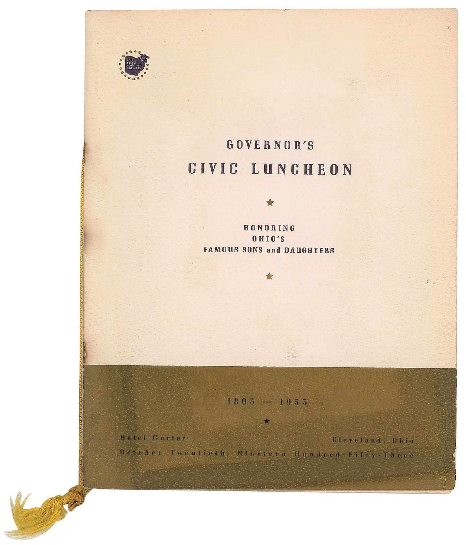 Program for a "Governor's Civic Luncheon Honoring Ohio's Famous Sons and Daughters" at Cleveland's Hotel Carter on October 20, 1953, twelve pages, 8.5 x 11, signed on the designated autograph page at the back of the program in black ballpoint by many in attendance, including: Ezzard Charles, Branch Rickey, Harry Stuhldreher, Johnny Kilbane, Tony Trabert, Harrison Dillard, Milton Caniff, Gloria DeHaven, Senator Thomas A. Burke, Harvey S. Firestone, Jr., Charles F. Kettering, Major Albert Warner, Norman Vincent Peale, and Earl Wilson. In fine condition, with irregular toning to the front cover. Accompanied by a TLS from Wilson forwarding the program to a collector.