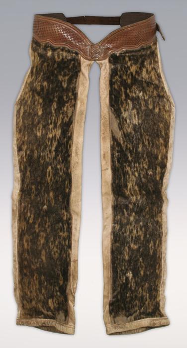 Spotted Seal Cowboy Chaps. Clark, Portland Oregon. Basket stamped belt. 1920s. RARE. Condition Report: Billet is excellent. The chaps have minor wear and bottom of both chaps. Very minor hide losses on the right leg, generally fine.