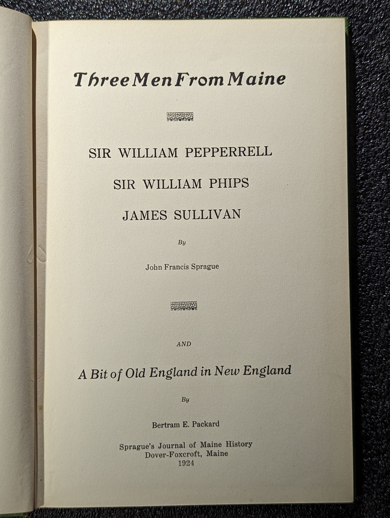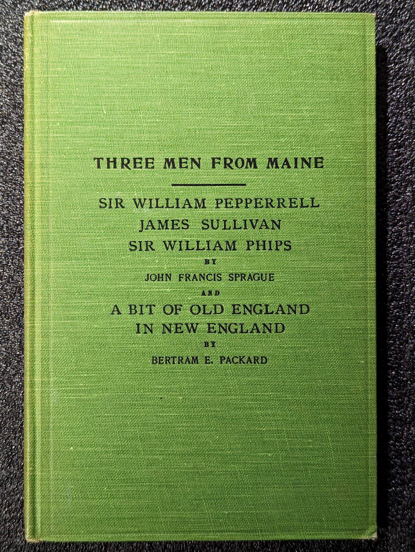 Sprague, John Francis & Bertram E. Packard. THREE MEN FROM MAINE. A BIT OF OLD ENGLAND IN NEW ENGLAND. Sprague's Journal of Maine History, Dover-Foxcroft. 1924. 8vo. (2), 89, (5) pages. Original green cloth, lettered in black. Historic photos. Historic prints. Fine. This book is a biography of 3 men from Maine: Sir William Pepperrell, James Sullivan, and Sir William Phips (who salvaged the 'Concepcion'). Lot weight: 0 lbs 10oz. Subject(s): Sunken Treasure.