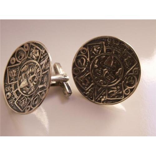 SRATLING WORKSHOP:<p>This pair is out and out stunning! This are very representative of the artists from the Spratling workshop 1933-1946. The back of the cuff links have a toggle with with a flat disc or circular button type hinge which are symbols of that workshop era. 1-1/4" Diameter - Marked Sterling, with a hallmark that appears to read hecho en and worn initial seal. initials.