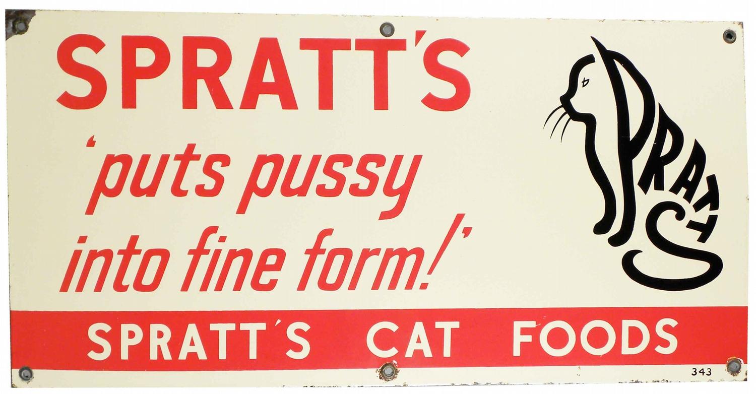 Sprats Cat Foods Porcelain Sign. Interesting Slogan!!!!! Edge chips and chips at top left grommet otherwise excellent condition. 24 X 12 inches.