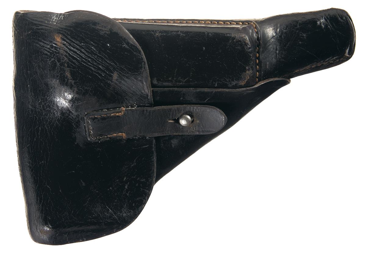 Late War production. Fixed sights, with standard slide markings on the left, and "eagle/ swastika", "eagle/ 88" and "**" on the right. Matching numbers, "88" proofs on multiple parts and "Be" on the left side of the lug. Fitted with ribbed brown grips. With a black leather holster marked "ikx/ eagle/ WaA869" (Gustav Sudbrack, Bielefeld) on the back.